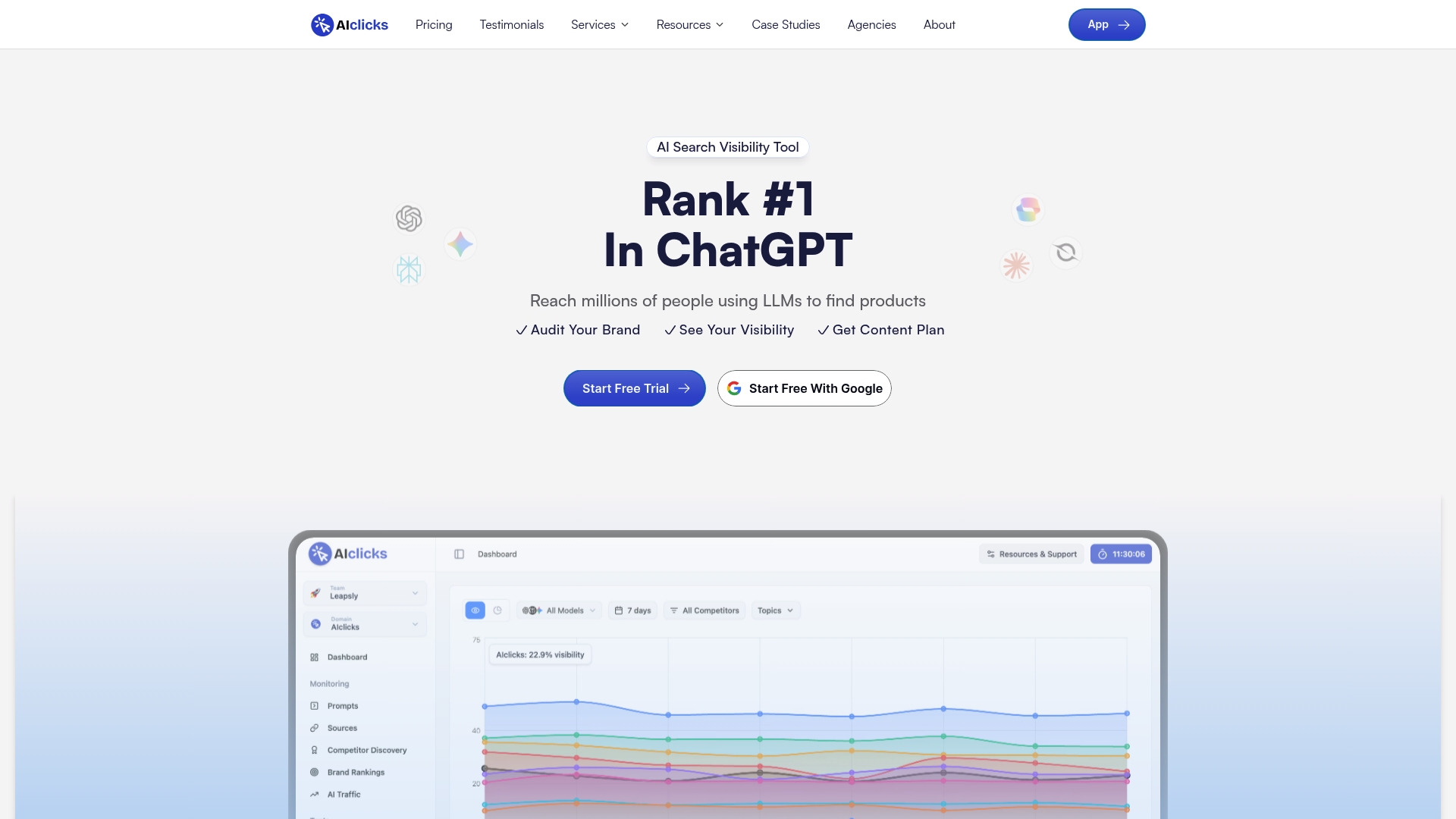 AIclicks.io segít, hogy a márkád megjelenjen AI vezérelt keresési eredményekben és chatbot válaszokban. A platform követi az AI említéseket több modellnél, elemzi a versenyt és javaslatokat ad tartalomoptimalizálásra, így növeli az esélyét annak, hogy a márkád legyen a top válasz. Erős dashboardokat és automatikus tartalomgenerálást kínál, ugyanakkor a díjszabás kisebb cégek számára terhet jelenthet. Használható ügynökségeknek és közepes méretű e‑kereskedőknek, akik célzott AI láthatóságot akarnak építeni.
