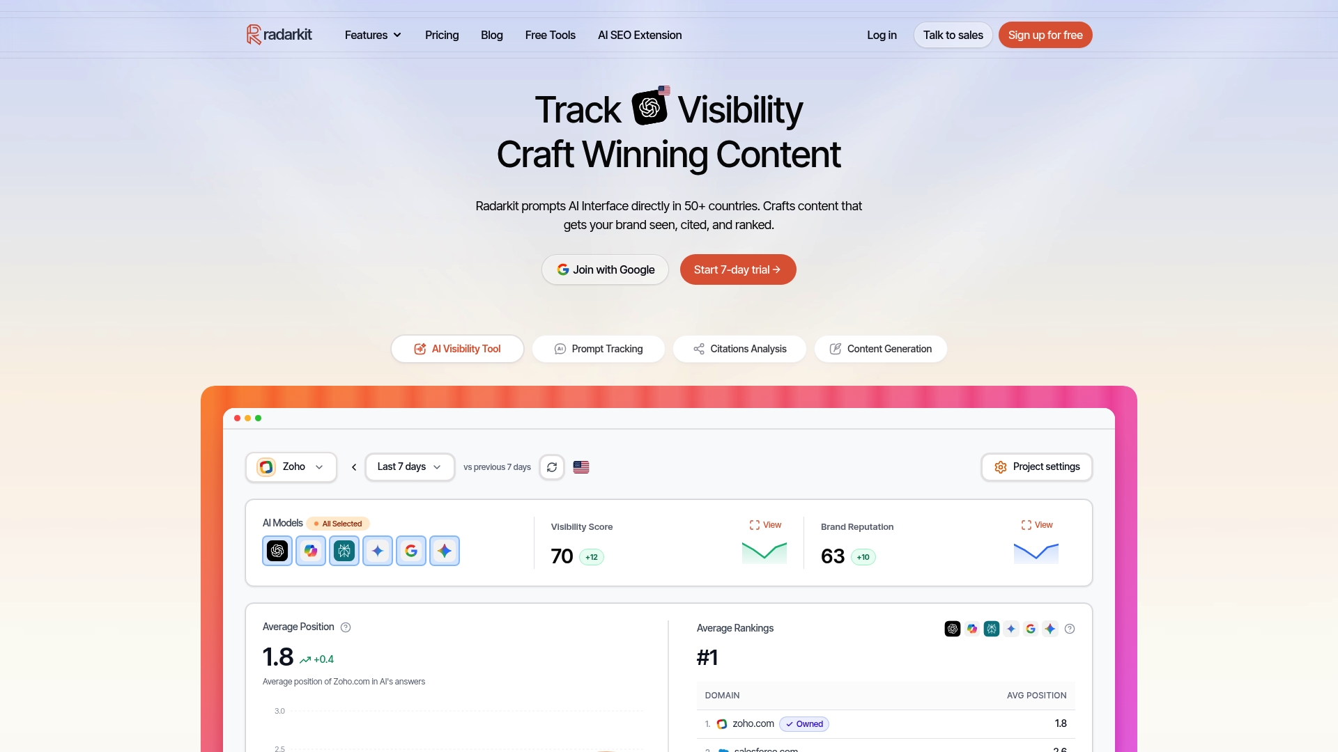 | Radarkit | AI láthatóság követése, forgalmi adatok monitorozása | Több AI asszisztens támogatása, részletes forráskövetés | API függőség, prémium árképzés | $29/hó |
