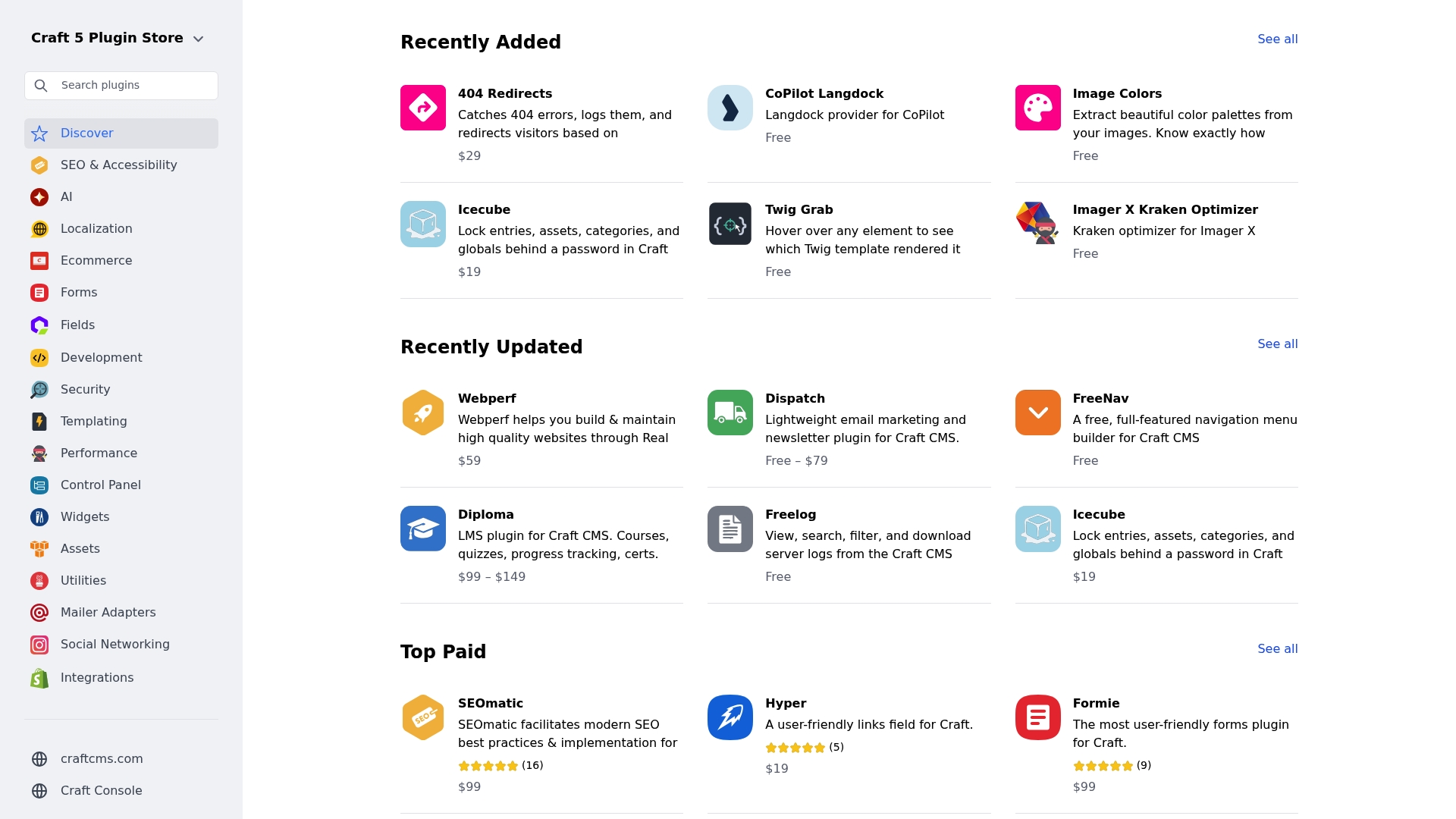 Il Craft CMS Plugin Store offre un catalogo esteso di plugin categorizzati che coprono SEO, AI, Localizzazione, Ecommerce e altro. È una vetrina centrale per trovare componenti compatibili con Craft 3, 4 e 5 e per consultare prezzi e aggiornamenti.