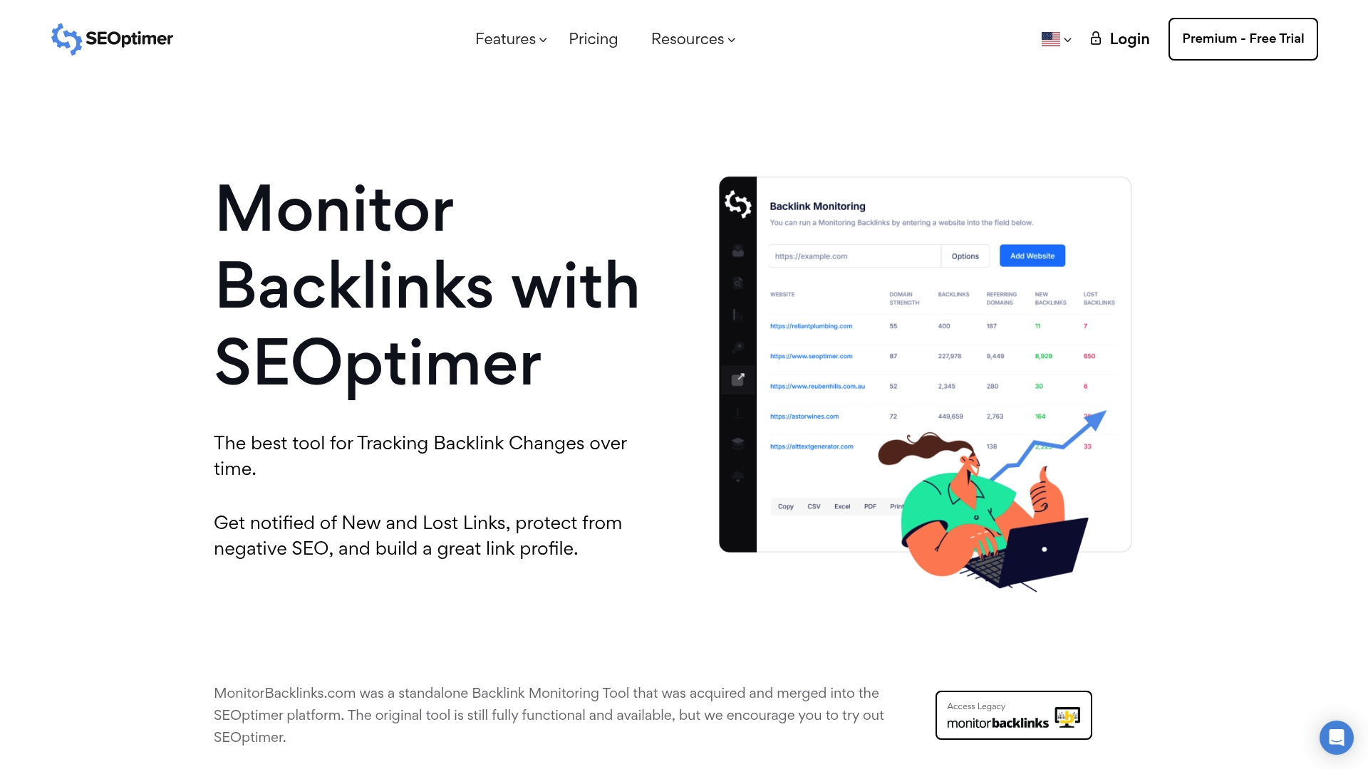 Monitor Backlinks combines persistent backlink monitoring with white label reporting and SEOptimer integration so agencies can monitor, report, and act from a single workflow. The legacy tool remains lightweight and focused on link health and recovery.