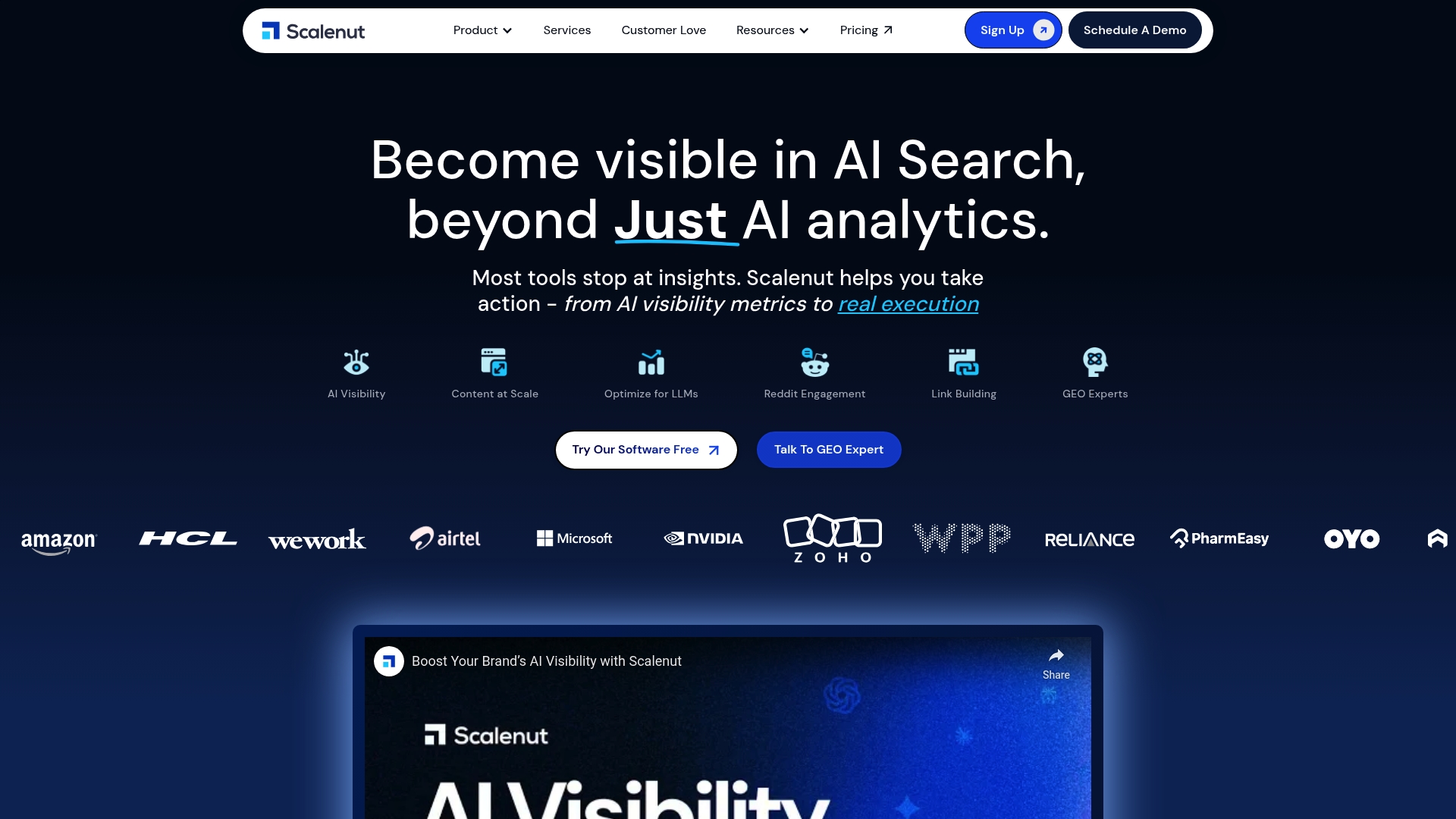 Scalenut kombiniert Content Erstellung mit direktem Fokus auf AI Sichtbarkeit und Linkbuilding. Die Plattform macht aus fragmentierten Tools einen zentralen Arbeitsbereich und liefert gleichzeitig Analysewerte, die speziell für AI Suchergebnisse relevant sind. Das ist nützlich wenn Sie organische Reichweite und Erwähnungen systematisch steuern wollen.