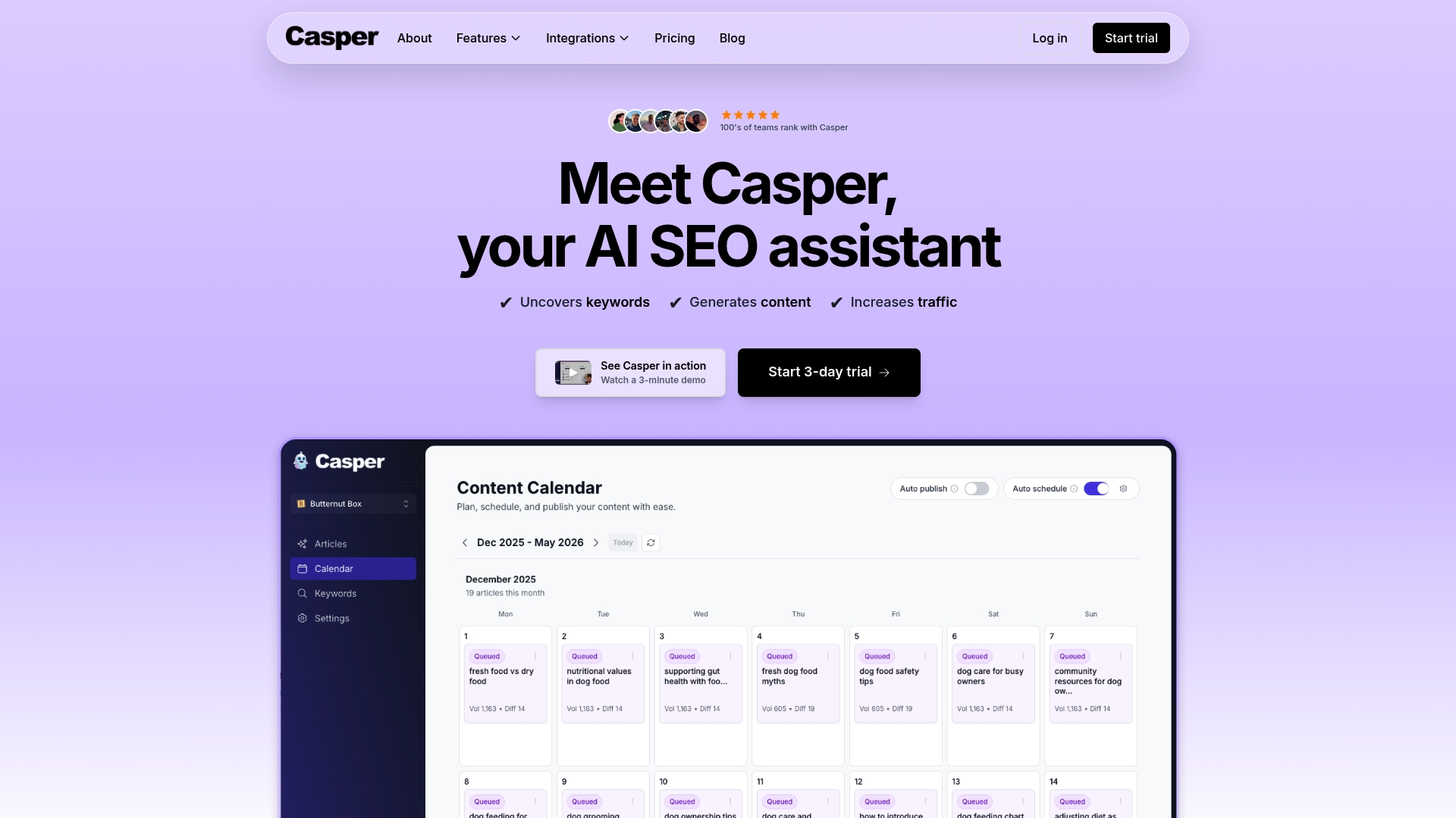 Casper combină analiza afacerii, descoperirea de cuvinte cheie și automatizarea publicării într-un flux continuu. Aceasta reduce munca manuală din content marketing și oferă o soluție all-in-one pentru cine vrea să gestioneze volume mari de articole optimizate SEO.