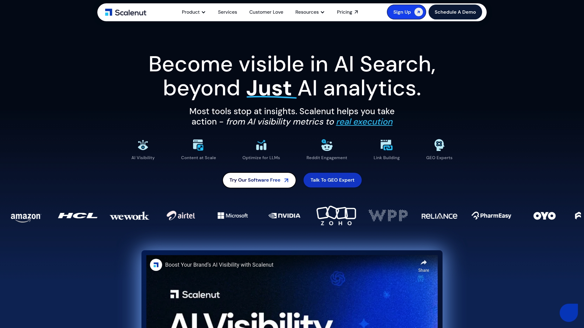 ScalenutSisältösuunnitelmat, GEO Action Center, Backlinks Marketplace.Kattaa sisällöntuotannon ja näkyvyyden seurannan, monipuoliset suunnitelmat sekä AI Visibility.Hinnoittelumalli monimutkainen uusille käyttäjille.Alk. $30/kk