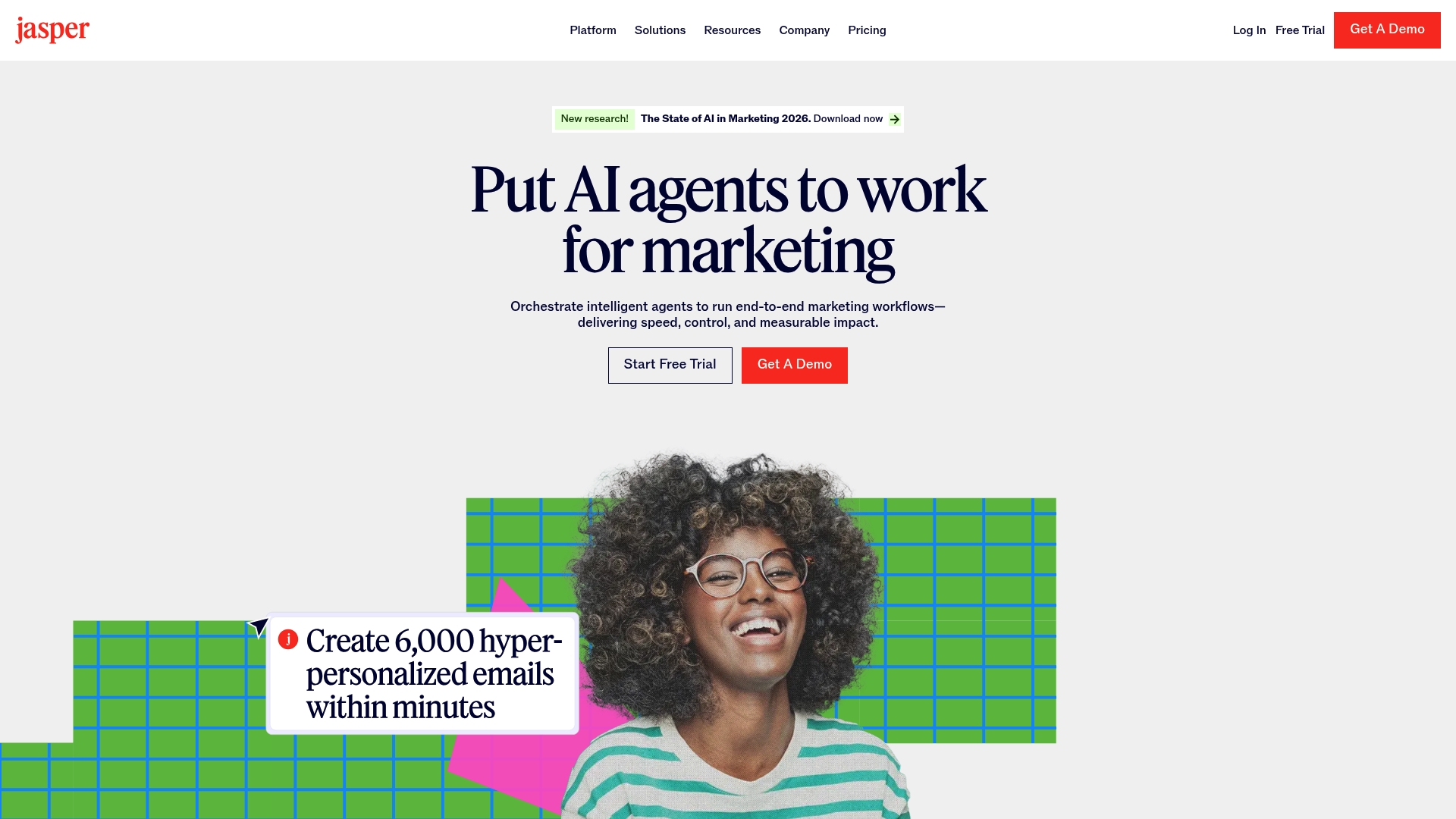 Platformen tilbyder end-to-end indholdspipelines, formålsbyggede AI-agenter og værktøjer til at bevare brandets stemme via indbyggede style guides. Jasper IQ overvåger indholdskvalitet, og hele miljøet understøtter personalisering, optimering og automatiserede marketingflows.