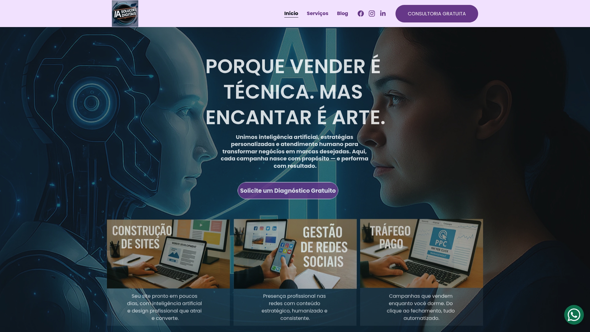 IA Soluções Digitais oferece estratégias de marketing digital sob medida, com uso de inteligência artificial para otimizações contínuas; criação de sites inteligentes e rápidos; gestão de redes sociais com conteúdo estratégico; campanhas de tráfego pago orientadas para ROAS; e soluções de automação como WhatsApp, CRM e chatbots para automatizar vendas e atendimento. Estas capacidades estão pensadas para trabalhar em conjunto: o site rápido capta, as campanhas pagas trazem tráfego, e a automação mantém a conversão e o relacionamento.