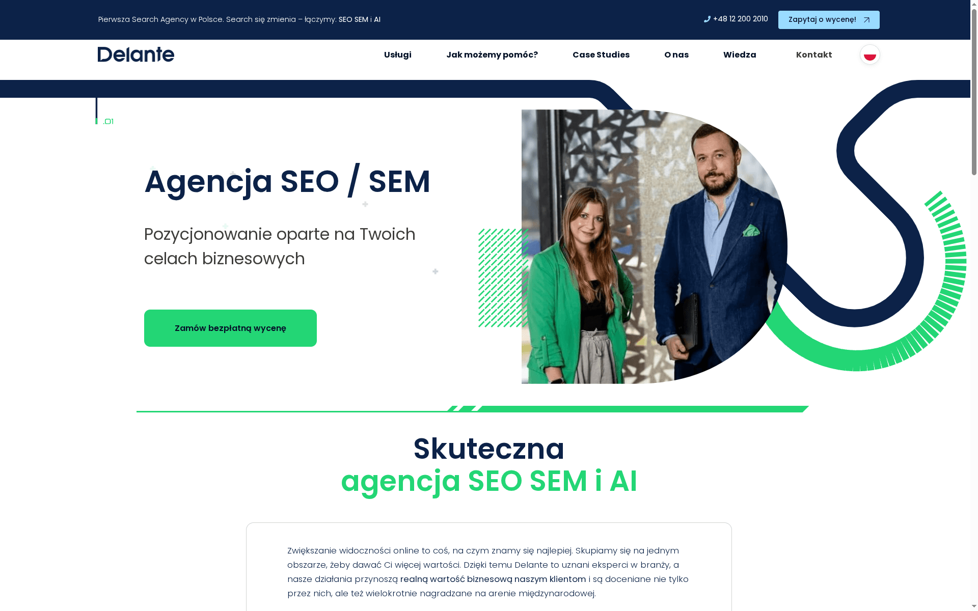 Delante to agencja search marketingu z Polski, która łączy SEO, SEM i narzędzia AI, by zwiększać widoczność klientów na rynkach międzynarodowych. Zespół ponad 65 ekspertów pracuje nad kompleksowymi strategiami — od audytu technicznego po kampanie płatne — z silnym nastawieniem na mierzalne KPI. W praktyce to wybór dla firm, które potrzebują pełnego wsparcia w wielu kanałach i krajach. Szybko. Skoncentrowanie na wynikach.
