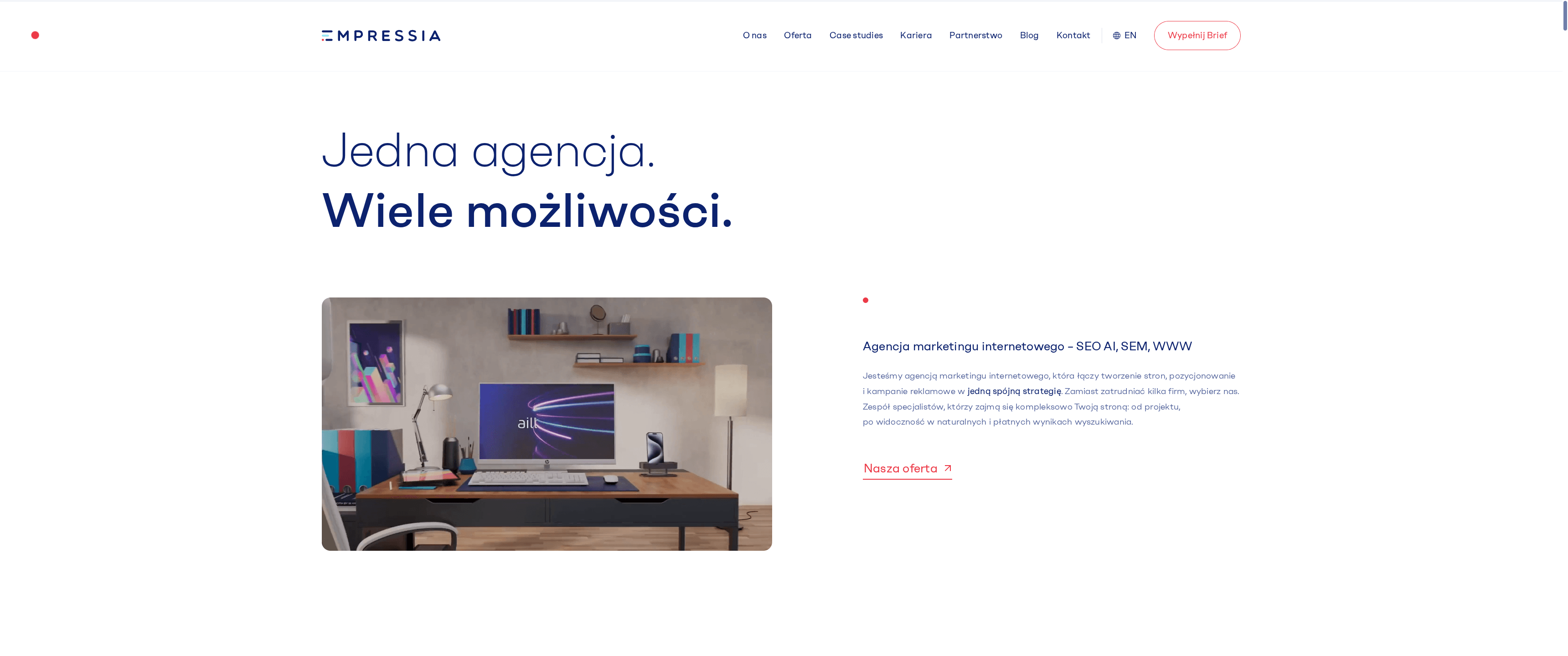 Empressia to doświadczona agencja marketingu internetowego działająca w Polsce od 2010 roku, oferująca kompleksowe usługi: SEO, SEM, web development, e‑commerce i content marketing. Firma łączy techniczne optymalizacje z kampaniami płatnymi i tworzeniem treści, co sprawia, że strategie są spójne i ukierunkowane na konwersję. To dobre rozwiązanie dla przedsiębiorstw poszukujących partnera, który prowadzi zarówno działania techniczne, jak i promocyjne. Krótko mówiąc: solidny integrator marketingu cyfrowego — o ile jesteś gotów na pełne zaangażowanie projektu.