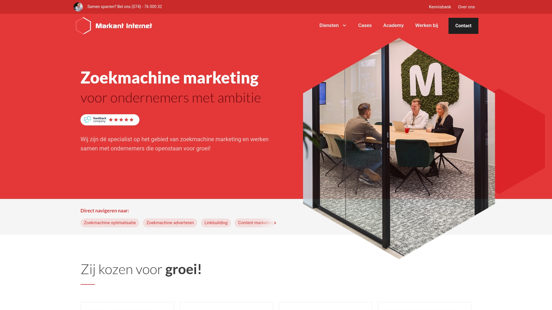 | Markant Internet | Zoekmachine marketing: SEO, SEA, linkbuilding, content marketing, conversie-optimalisatie. | Transparante rapportages, maatwerk strategieën, resultaatgerichte campagnes. | Hogere kosten afhankelijk van maatwerk, mogelijk langere doorlooptijd voor SEO-resultaten. | Offerte op maat |