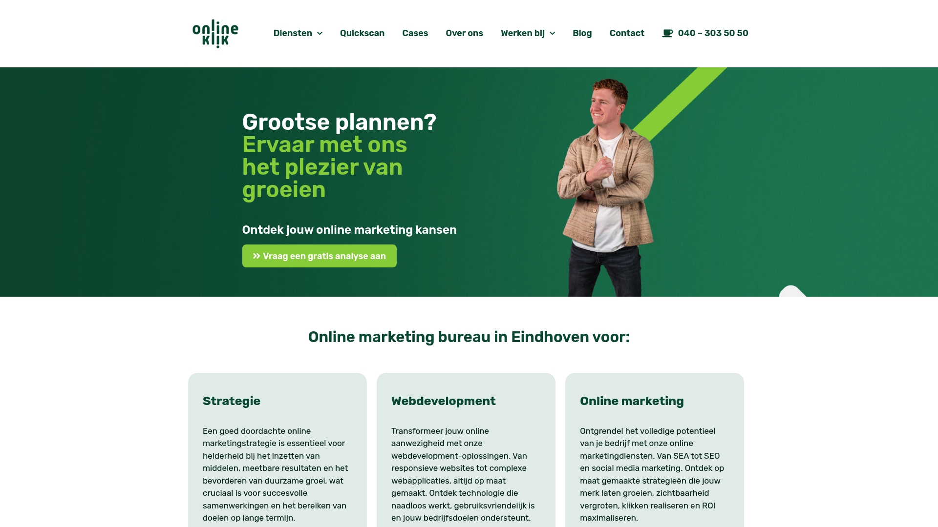 Online Klik is een full-service online marketingbureau uit Eindhoven dat een brede set diensten levert: van SEO en SEA tot webdevelopment, data-analyse en creatieve ontwerpen. Voor MKB-eigenaren die één betrouwbare partner willen voor strategie én uitvoering biedt Online Klik een samenhangende aanpak met vaste contactpersonen en transparante communicatie. De focus ligt op zichtbaarheid, conversie en datagedreven optimalisatie. Kort. Praktisch. Gericht op resultaat.