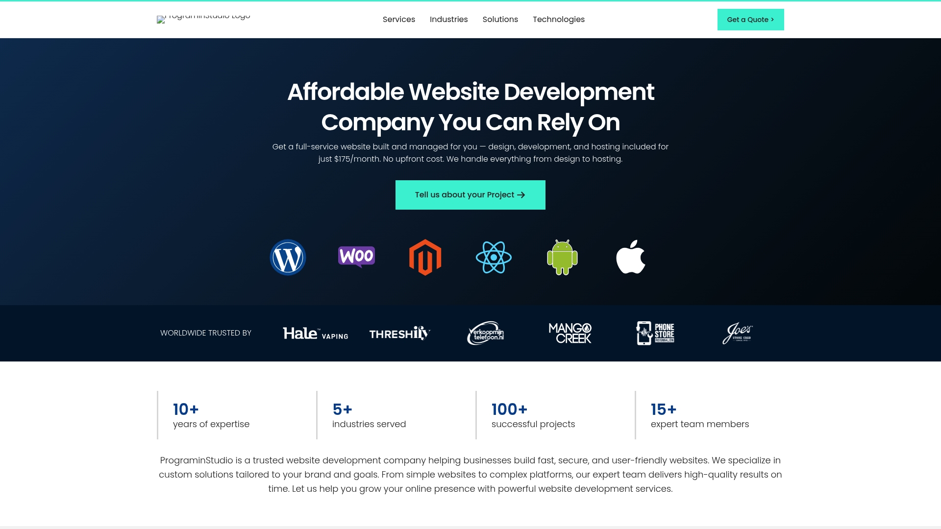 ProgramInStudio tilbyder full-service web- og app-udvikling med pakker fra $175/month og over 10 års erfaring i brancher som E‑commerce, Ejendom og Sundhed. Kort sagt: en prisvenlig leverandør til virksomheder, der vil spare på startomkostninger og få løbende support. Samtidig er der klare begrænsninger i, hvor dybtgående de lover specialtilpasning og digital markedsføring efter lancering.