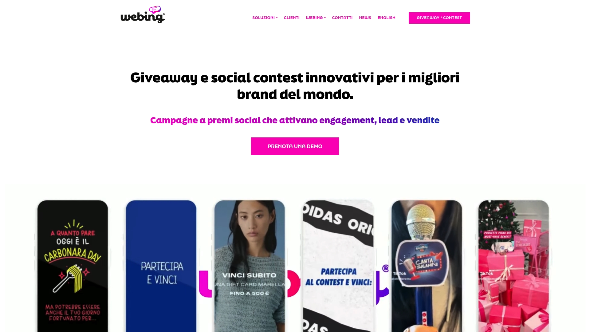 Webing gestisce contest su Instagram, Facebook, TikTok e WhatsApp con formati creativi come giveaway natalizi, contest automatizzati e iniziative audio (Voicegasmic). La piattaforma include strumenti come comment picker, chatbot e la tecnologia proprietaria giveawai™ per automatizzare verifiche e selezioni. Webing Plus certifica la conformità legale e GDPR, e la piattaforma supporta l’intero processo: strategia, attivazione, raccolta lead e fase post-campagna. Il flusso è pensato per chi vuole lanciare campagne complesse in tempi brevi e con analisi data-driven.