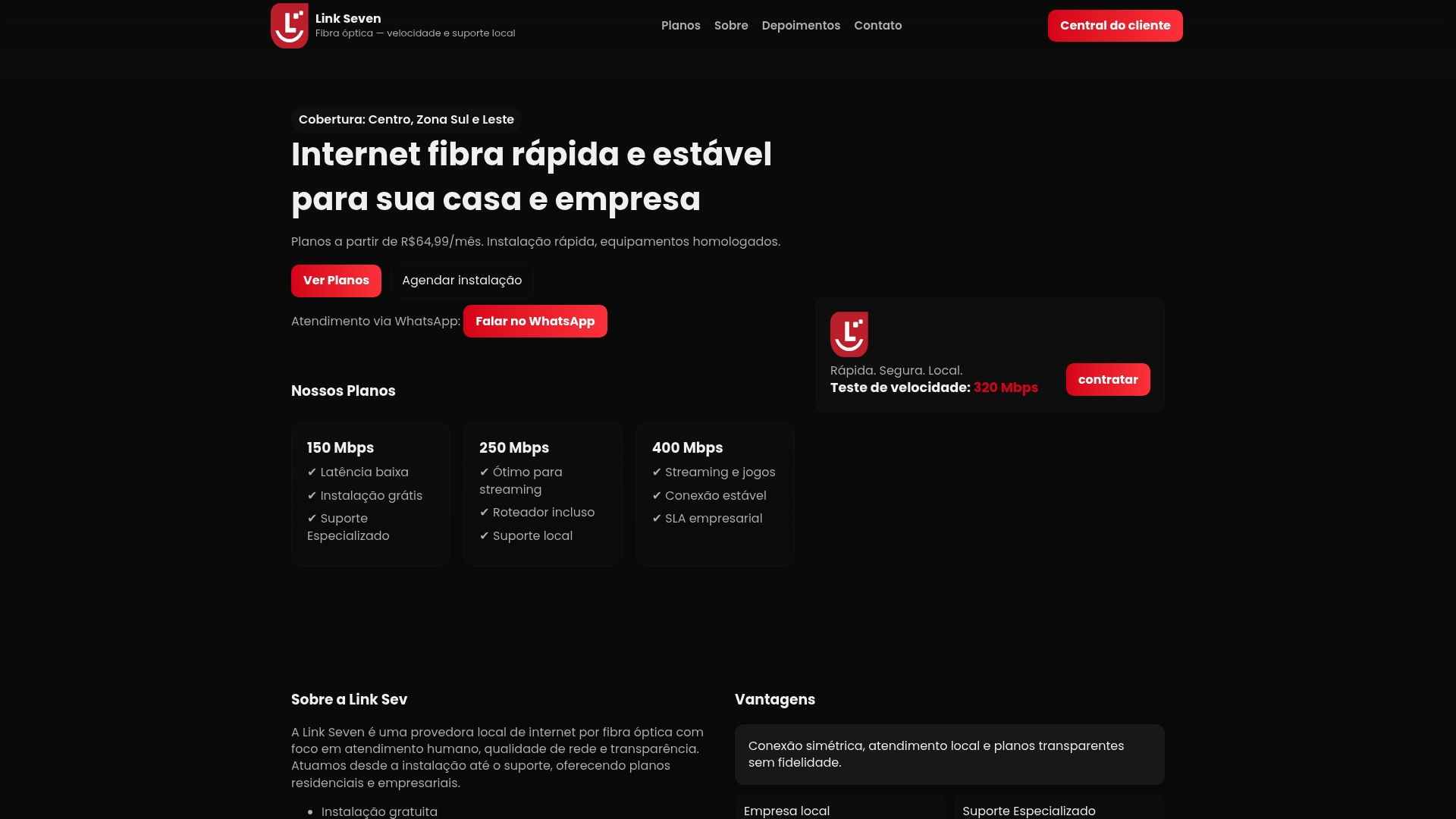 | Link Seven | Conexão de fibra óptica simétrica, suporte local, instalação gratuita | Conexão estável, sem fidelidade, suporte humano próximo | Cobertura geográfica limitada | A partir de R$64,99/mês |