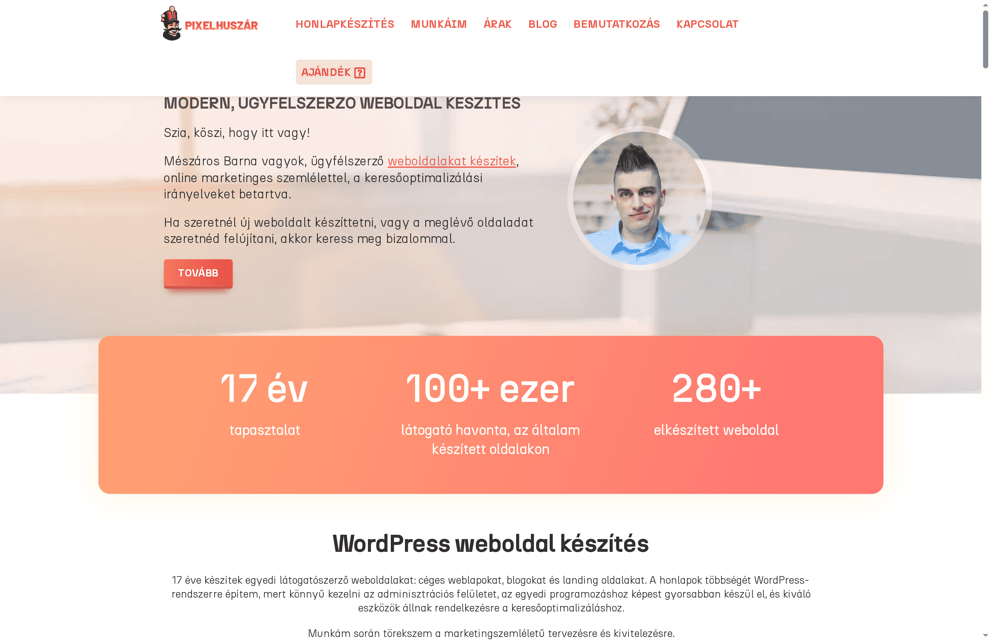 Mészáros Barna, a Pixel Huszar mögött álló szakember 17 év tapasztalattal készít WordPress alapú, keresőoptimalizált és marketingorientált weboldalakat. Alapvetően kis- és középvállalkozások számára nyújt gyors, megbízható kivitelezést és hosszú távú támogatást. Az ajánlat erőssége a személyes szakértelem és a teljes körű szolgáltatás; hátránya a rugalmas, de egyedi árazás és a főként WordPress-központúság. Röviden: gyakorlatias, szakmai megoldás, ha szeretné, hogy a weboldal nem csak szép, de ügyfeleket is hozzon.