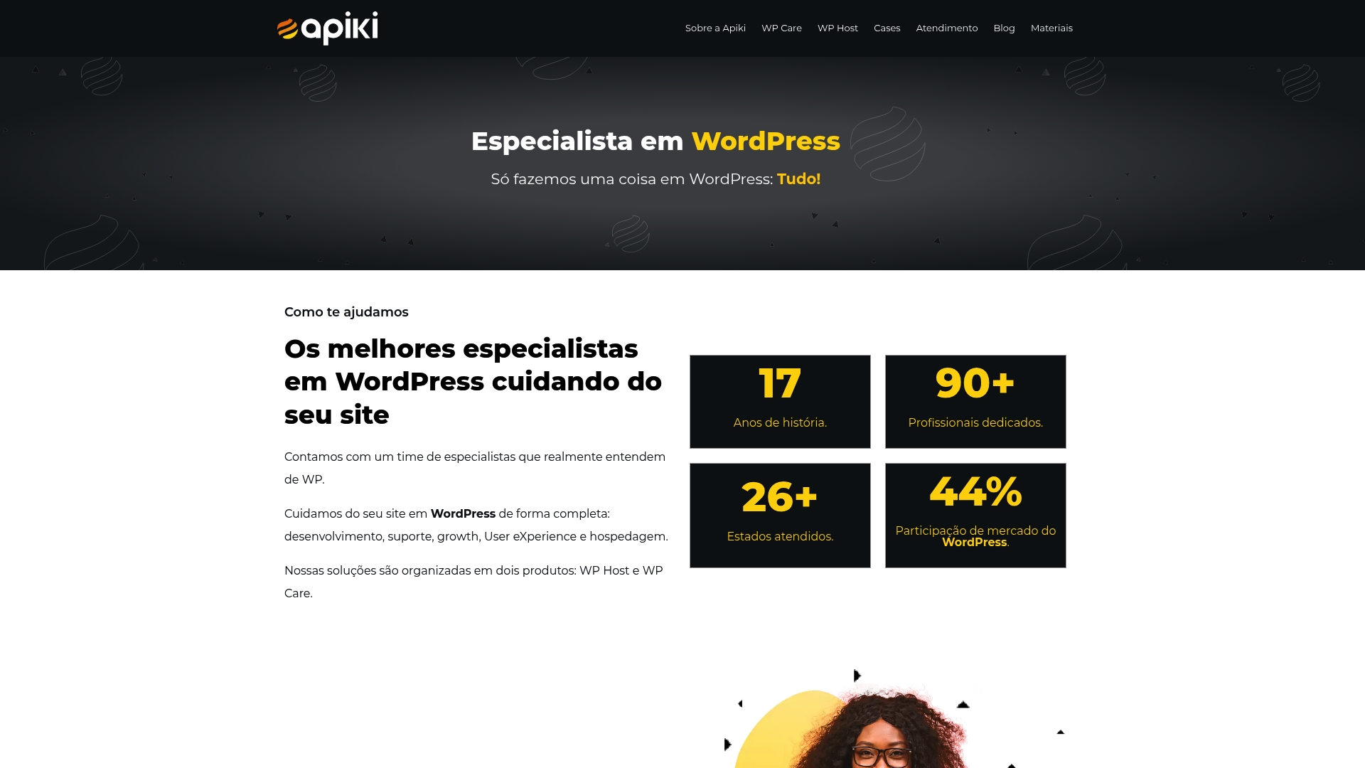 Apiki é uma agência/fornecedor brasileiro com foco exclusivo em WordPress, destacando-se pela combinação de desenvolvimento personalizado, suporte contínuo e hospedagem gerida. Com 17 anos de atividade e mais de 90 profissionais, a empresa apresenta-se como líder no mercado brasileiro, com 44% de participação no segmento de WordPress. Para proprietários de pequenas e médias empresas em Uberlândia que usam WordPress, Apiki oferece uma solução integrada capaz de reduzir fricções técnicas e acelerar melhorias de UX.
