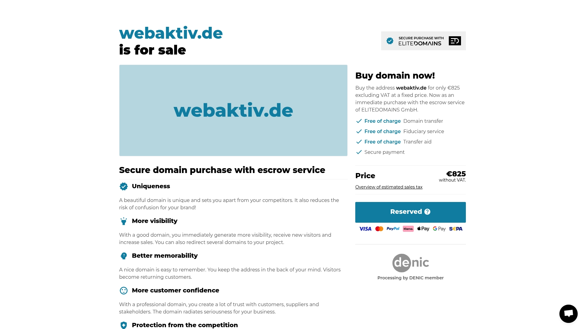 webaktiv.de wird aktuell als Premium-Domain über ELITEDOMAINS GmbH mit sicherem Treuhandverkauf angeboten und kostet pauschal €825 zzgl. Mehrwertsteuer. Für kleine Agenturen und Solo-Unternehmer, die schnell an Sichtbarkeit gewinnen wollen, ist das Angebot klar strukturiert: Kauf mit Escrow-Schutz, kostenlose Transferhilfe und mehrere sichere Zahlungsmöglichkeiten. Kurz gesagt: Wer eine prägnante, vertrauenswürdige Webadresse will und den Kaufprozess abgesichert haben möchte, findet hier eine direkte, risikoärmere Option.