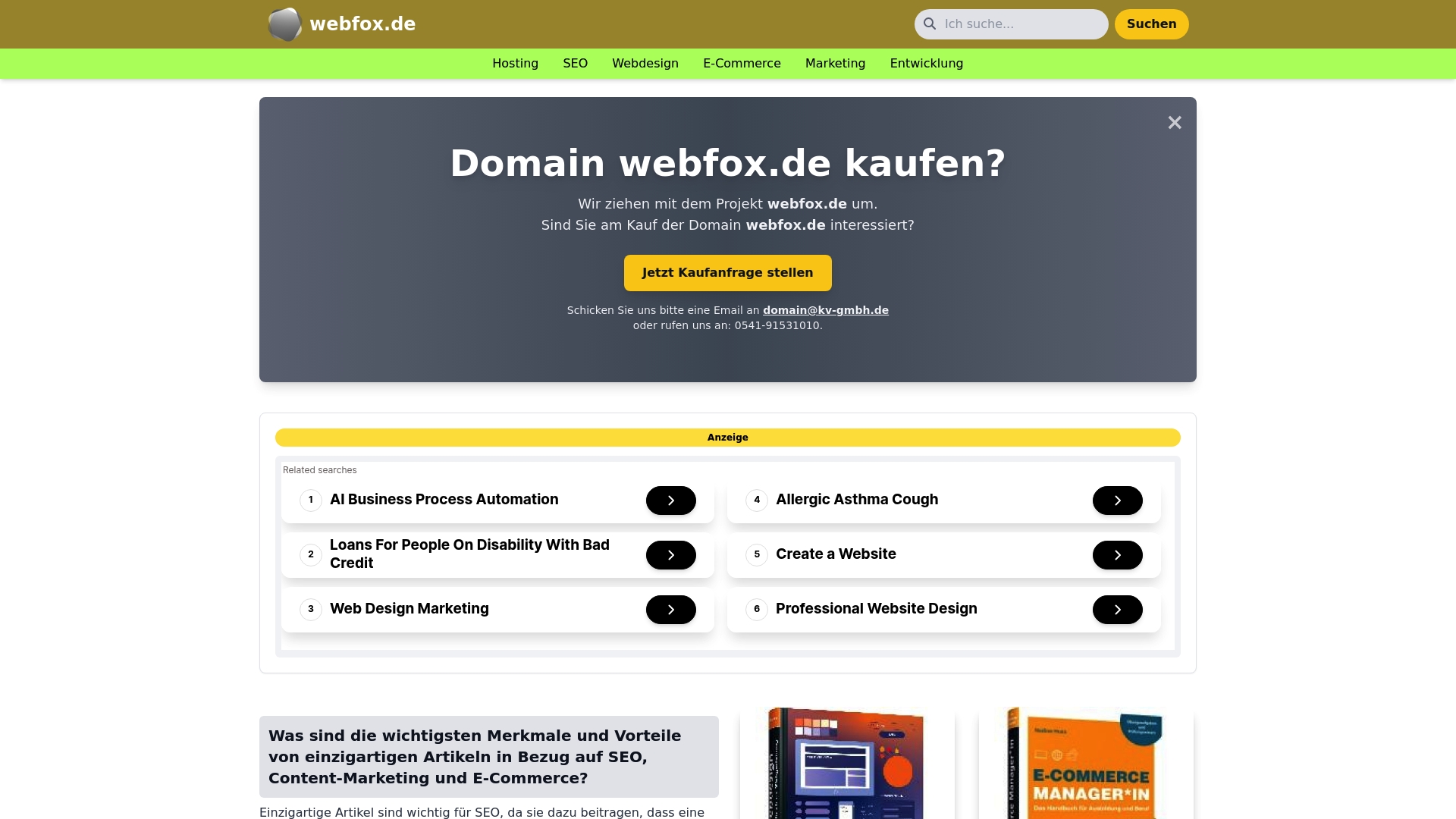 Webfox.de ist ein Informationsportal für SEO, Webdesign und E-Commerce mit zusätzlicher Möglichkeit zum Domainkauf. Die Seite liefert Artikel, Guides und Produkte, die Kleinunternehmern in Osnabrück praktische Hinweise geben, wie sie online sichtbarer werden. Für Anwender, die konkrete Tools oder Preise erwarten, bleibt Webfox.de eher eine Inspirationsquelle als ein Shop. Insgesamt eignet sich die Plattform gut als Startpunkt für Strategie und Domainbeschaffung, aber nicht als Fullservice-Agentur.