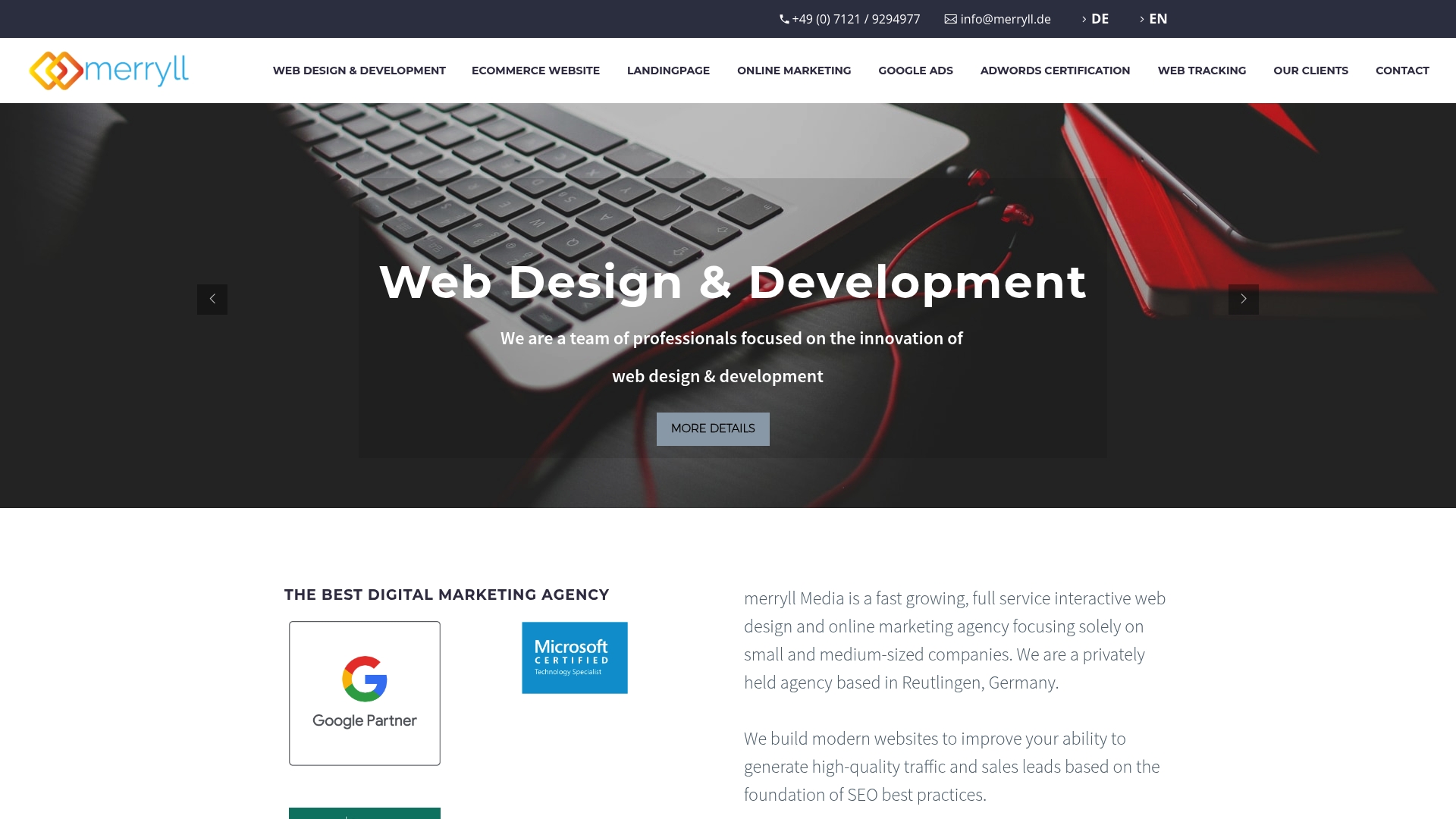 Merryll Media ist eine wachstumsorientierte Full Service Agentur aus Reutlingen, die sich auf kleine und mittlere Unternehmen konzentriert. Die Agentur kombiniert modernes Webdesign mit Online Marketing und liefert messbare Kampagnenergebnisse.
