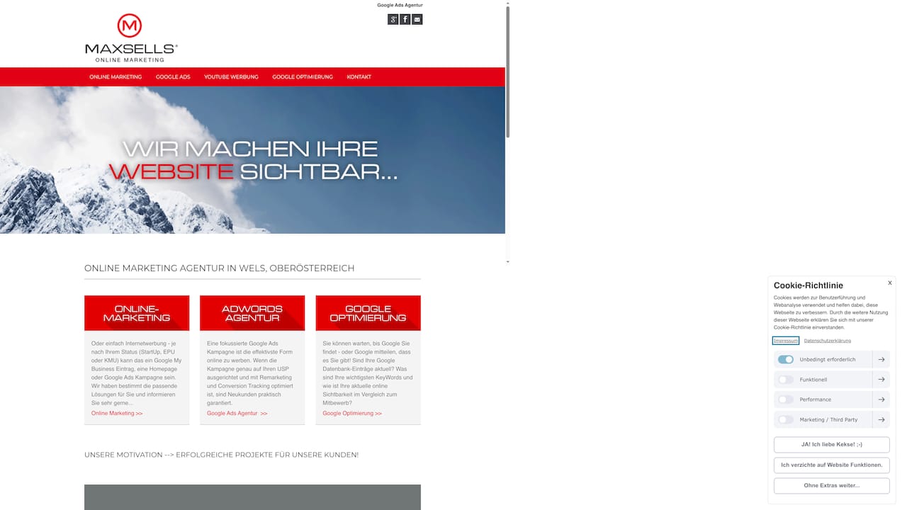 Maxsells bietet Google Ads Kampagnenmanagement, YouTube Advertising, SEO-Unterstützung sowie ein SEO/SEA Glossar zur Orientierung an. Ergänzt wird das Angebot durch Beratungen für Online Marketing und konkrete Maßnahmen zur Verbesserung der Präsenz in Google My Business.