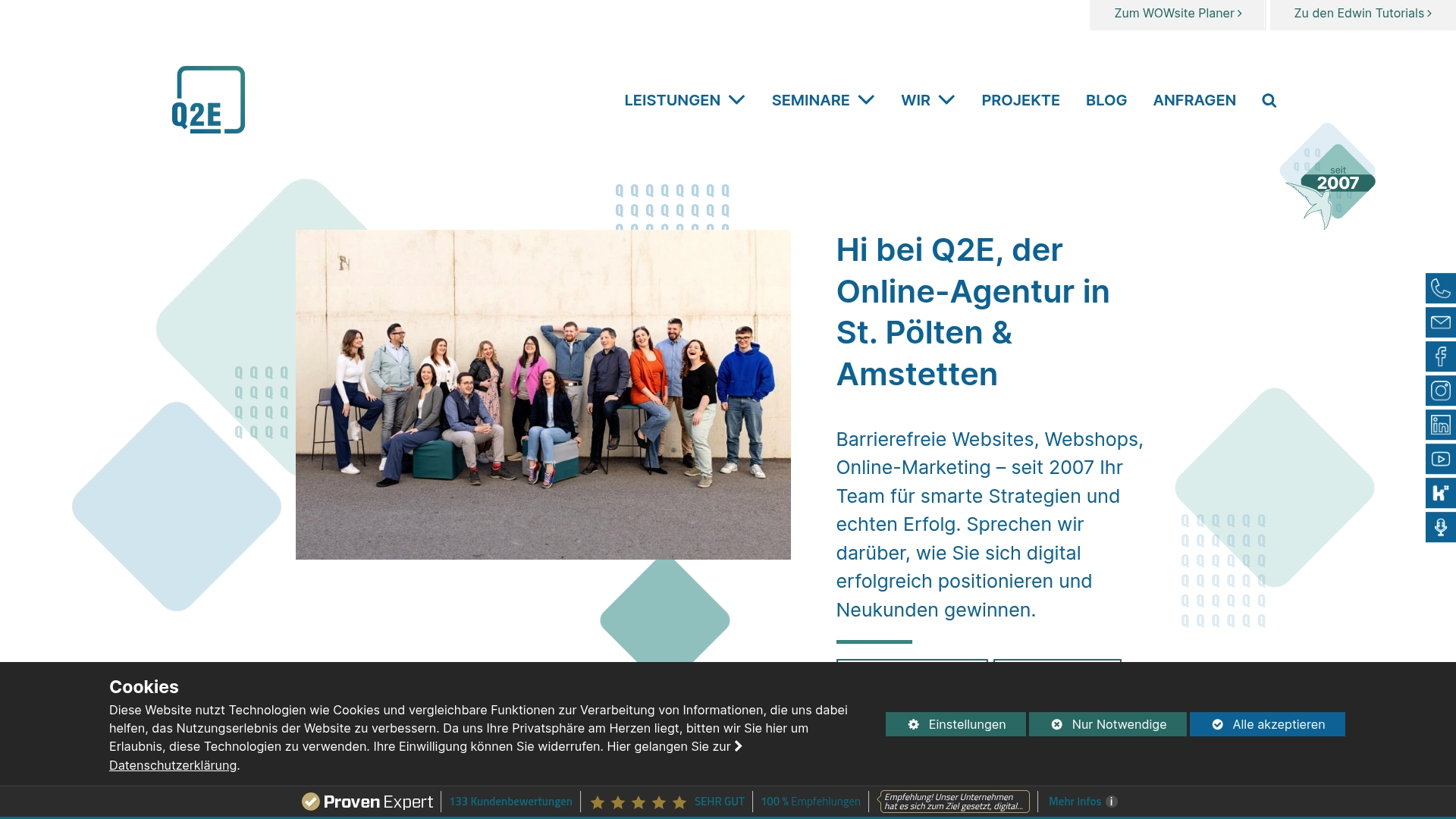 Q2E bietet Web Accessibility, Webdesign, Webshops und eine Content-Strategie mit KI an, ergänzt durch Digitalisierung und Datenschutzberatung. Der WOWsite Planer dient als schnelles Planungstool für Website-Designs und reduziert Abstimmungsaufwand zwischen Kunde und Agentur.
