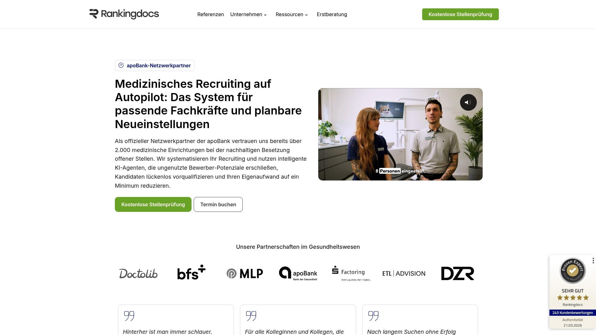 Rankingdocs bietet ein KI-gestütztes Recruiting-System speziell für medizinische Einrichtungen und arbeitet weitgehend auf Autopilot. Das System verspricht planbare Neueinstellungen durch gezielte Ansprache von Fachkräften im sogenannten "unsichtbaren Markt".