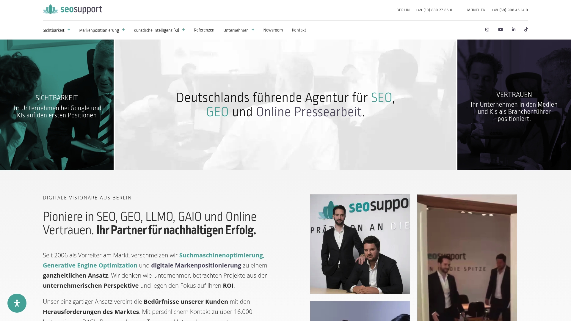 seosupport GmbH ist eine etablierte deutsche Agentur mit Büros in Berlin und München und operiert seit 2006 im Bereich SEO und digitale Markenführung. Die Agentur kombiniert traditionelle SEO mit KI-basierten Optimierungsstrategien, was sie besonders für Projekte mit Anspruch an technische Tiefe interessant macht. Kurz gesagt. Kontakt lohnt sich vorab.