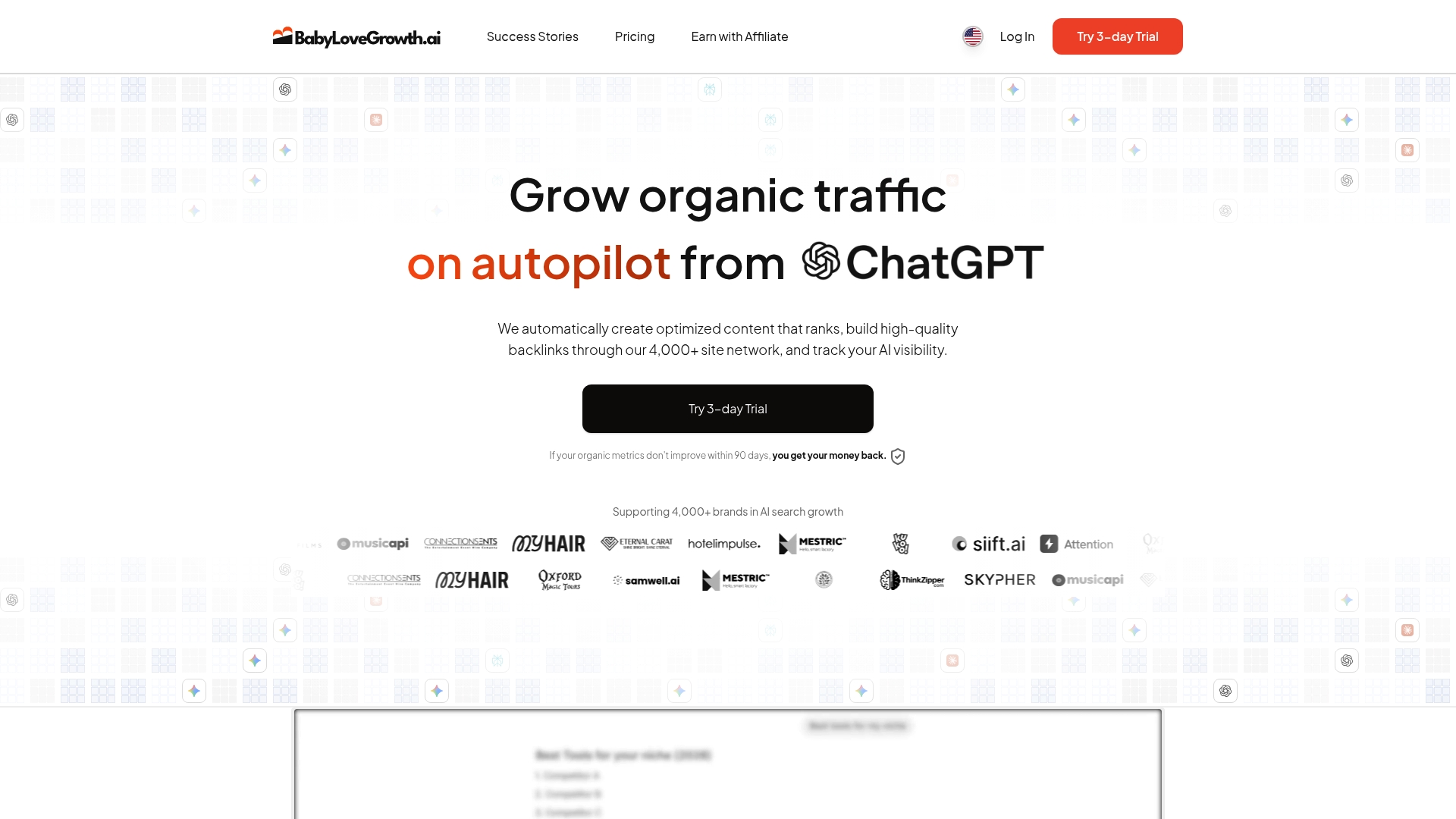 BabyLoveGrowth kombinerer automatiseret indholdsproduktion med et stort backlink-netværk og tekniske analyser for at skabe vedvarende vækst. Platformen tilbyder også AI-synlighedssporing og flersproget support så dit indhold fungerer globalt.
