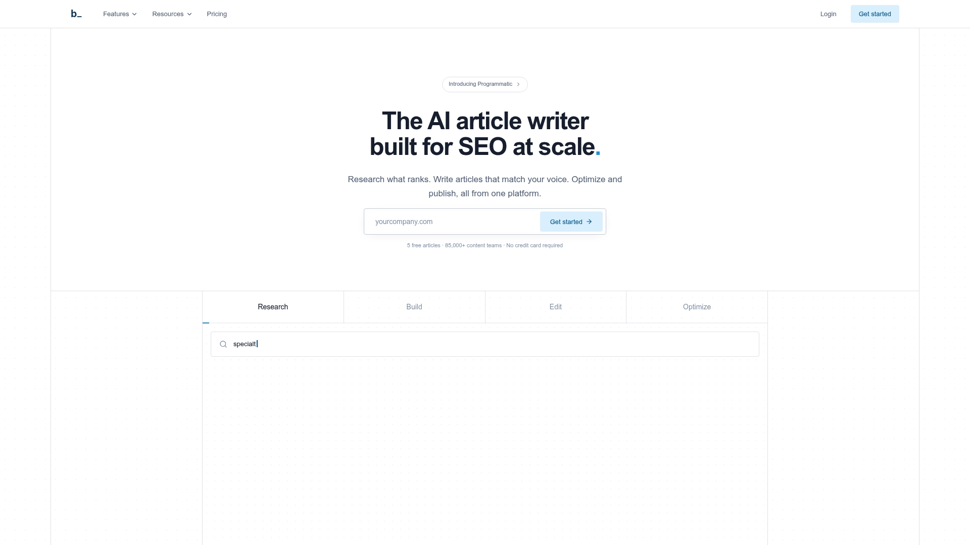 Platforma combină Research Intelligence pentru identificarea subiectelor relevante cu AI Generation care produce articole orientate spre ranking. În plus oferă Smart Optimization cu scor SEO în timp real, Programmatic SEO pentru șabloane scalabile și pagini gestionabile fără suport de inginerie. Integrările includ WordPress, Webflow, Notion, HubSpot și Shopify.