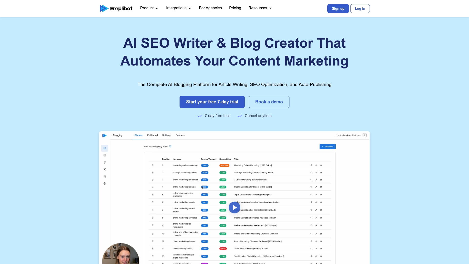Emplibot είναι μια πλατφόρμα περιεχομένου με AI που αυτοματοποιεί συγγραφή άρθρων, SEO και αυτοματοποιημένη δημοσίευση για να εξοικονομήσετε χρόνο. Η βασική πρόταση είναι απλή και στοχευμένη: παραγωγή ποιοτικού περιεχομένου με μικρή χειροκίνητη παρέμβαση.