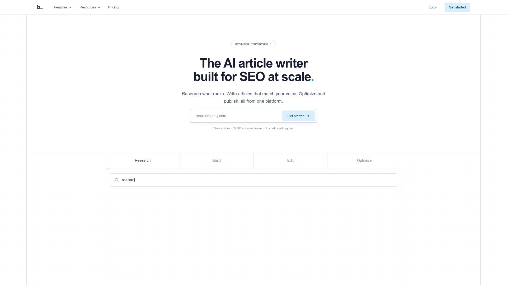 Η πλατφόρμα προσφέρει Έξυπνη Έρευνα (Research Intelligence) για ανάλυση SERP και εντοπισμό πρόθεσης αναζήτησης. Παράγει περιεχόμενο με AI Generation χρησιμοποιώντας πρότυπα και προσαρμοσμένη φωνή. Προσθέτει Smart Optimization με σκορ SEO και προτάσεις για λέξεις-κλειδιά και αναγνωσιμότητα. Υποστηρίζει Programmatic SEO και διαχείριση Pages για χιλιάδες σελίδες χωρίς ανάγκη μηχανικών επεμβάσεων.