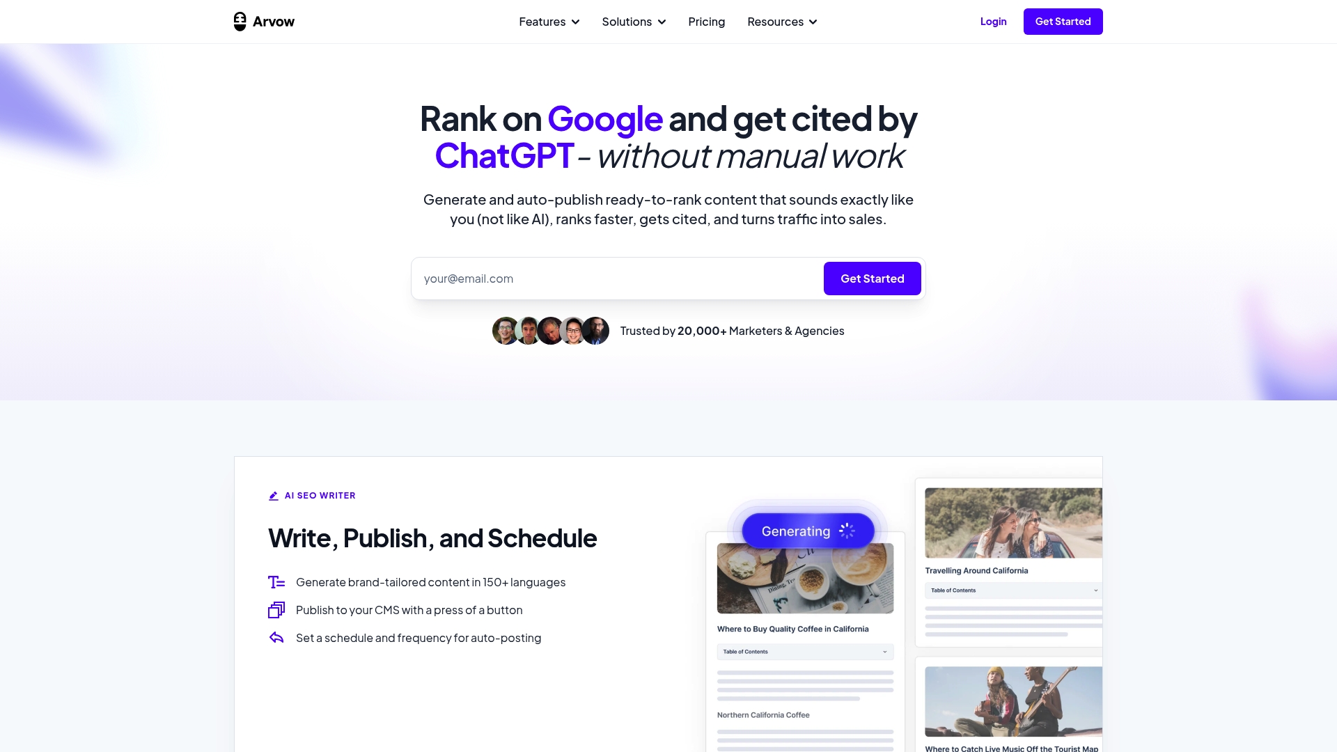 Arvow je AI řízená platforma pro tvorbu obsahu a SEO automatizaci zaměřená na marketéry, agentury a e‑commerce týmy. Nabízí end‑to‑end workflow od AI psaní přes optimalizaci až po automatické publikování.