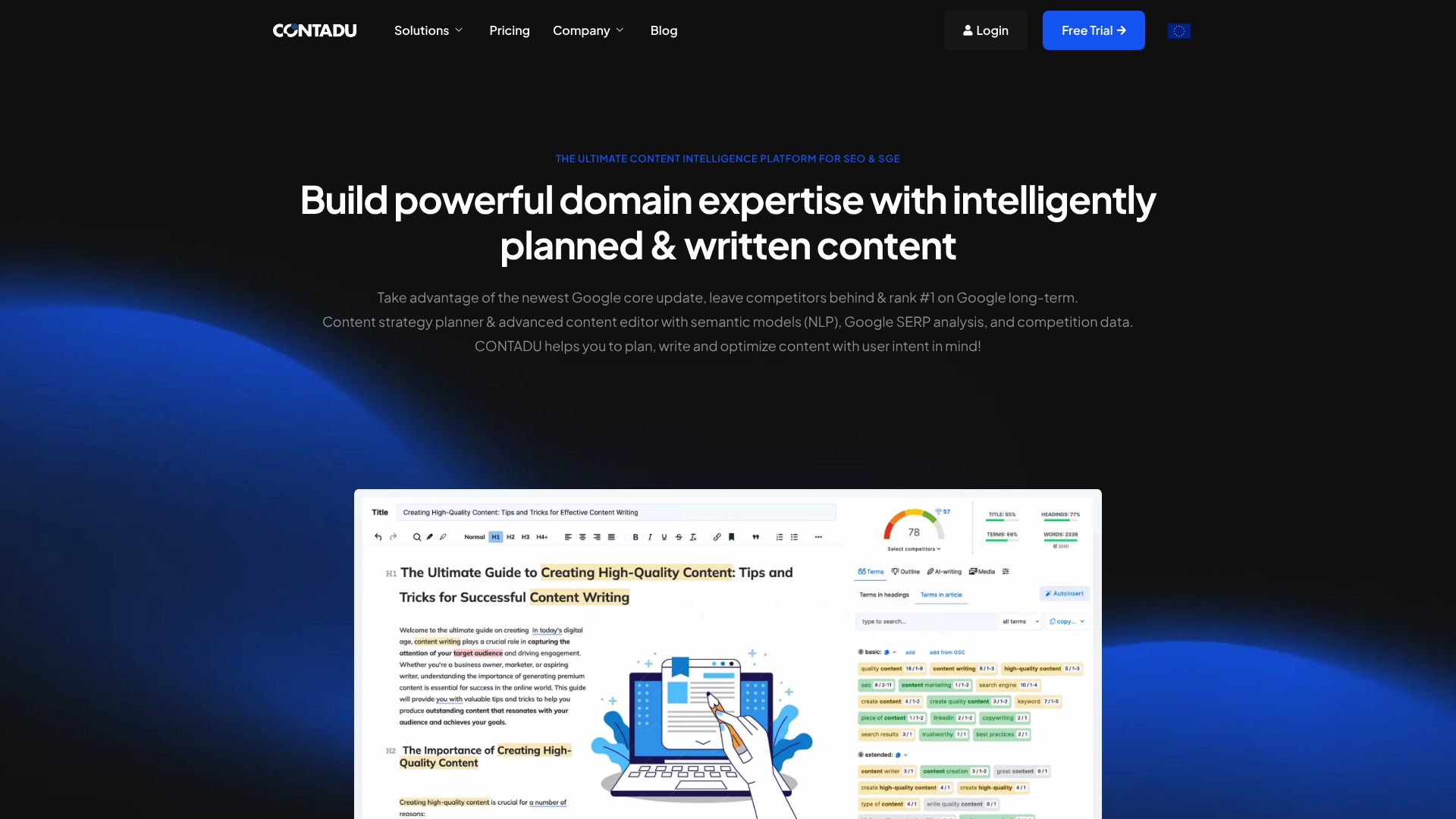| Contadu | Insights semânticos, análise de concorrentes, planeamento editorial | Ferramentas de palavras-chave integradas, relatórios pormenorizados | Preços elevados para microempresas, curva em NLP | A partir de $37/mês |