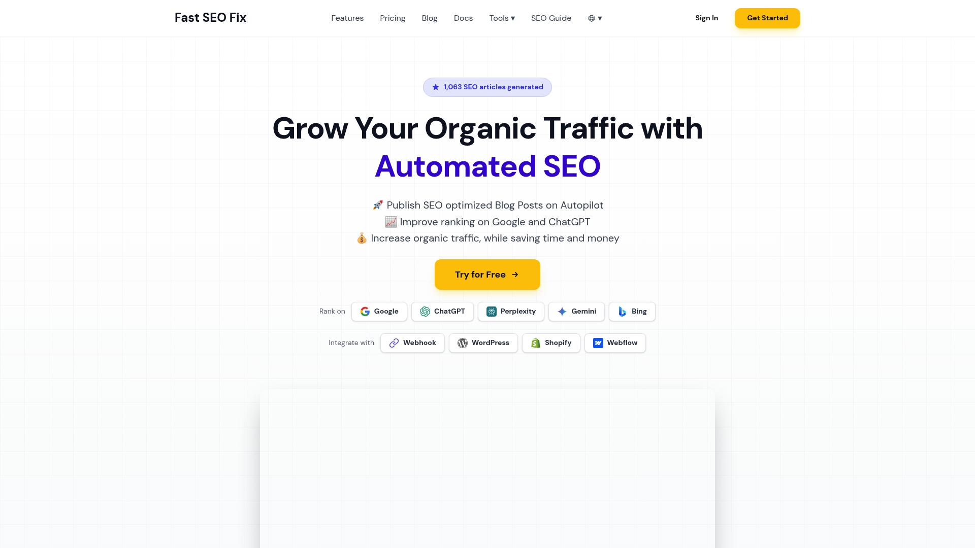 Fast SEO Fix on automatisoitu SEO-alusta, joka analysoi sivuston, luo hakukoneoptimoitua sisältöä ja julkaisee postauksia päivittäin. Se sopii yrityksille ja digimarkkinoijille, jotka haluavat skaalata orgaanista liikennettä ilman jatkuvaa manuaalista julkaisutyötä mutta vaatii silti laadunvalvontaa.