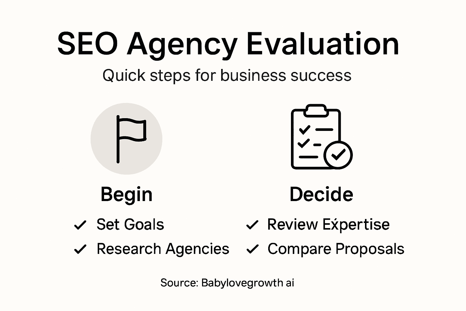 | 1. Define clear SEO goals | Ensure your SEO objectives are specific, measurable, and aligned with overall business growth to select the right agency. |