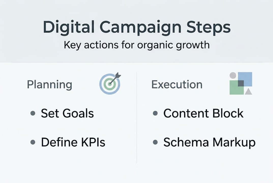 Most digital campaigns fail quietly. You pour budget into ads, publish a few blog posts, and wait for traffic that never comes. The problem usually isn't effort. It's that most SMB marketing plans were built for a search landscape that no longer exists. Google has changed, AI-powered search is reshaping how people find answers, and the old playbook of stuffing keywords into content just doesn't work anymore. This guide walks you through a practical, modern framework for planning digital campaigns that actually build organic traffic, from setting the right goals to launching content that ranks on both Google and AI-powered platforms.