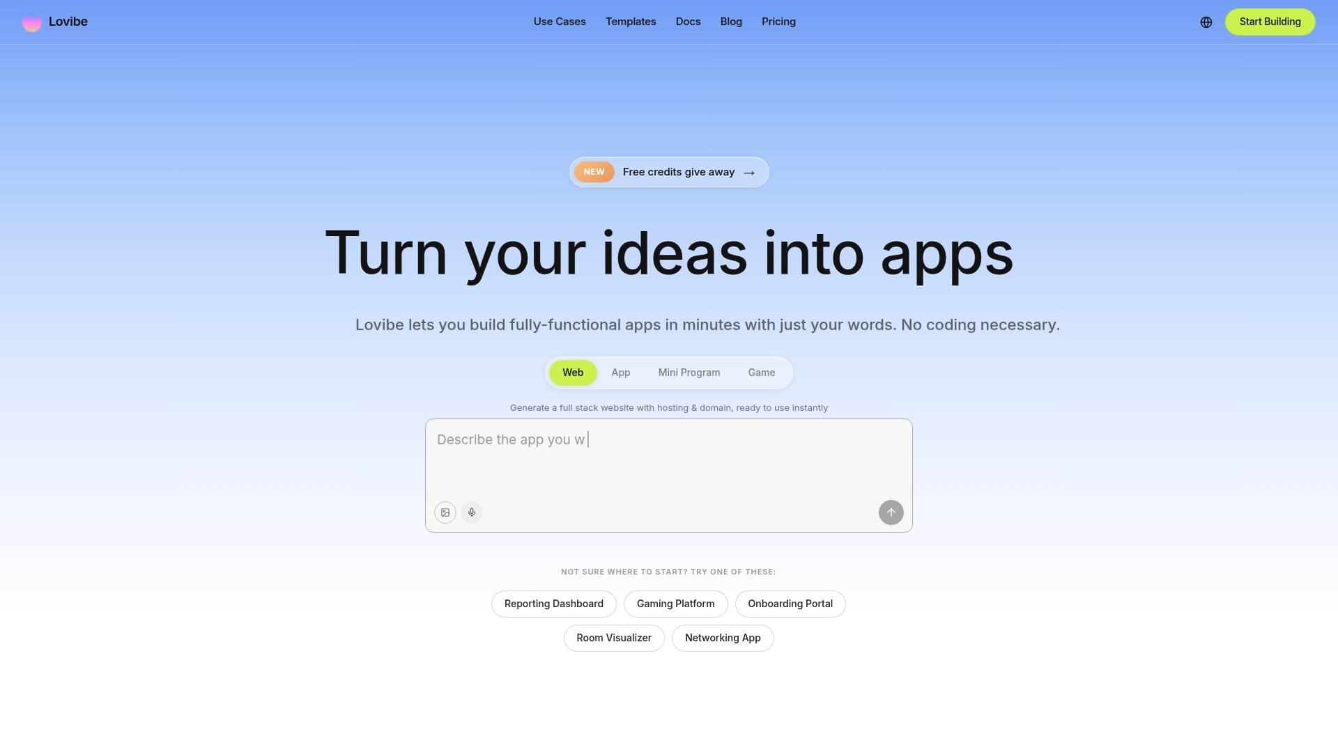 Lovibe laat je binnen enkele minuten werkende apps maken met alleen tekstinstructies, zonder code. Het platform combineert no code app bouwen, automatische hosting en domeininstallatie en ondersteuning voor moderne AI modellen.