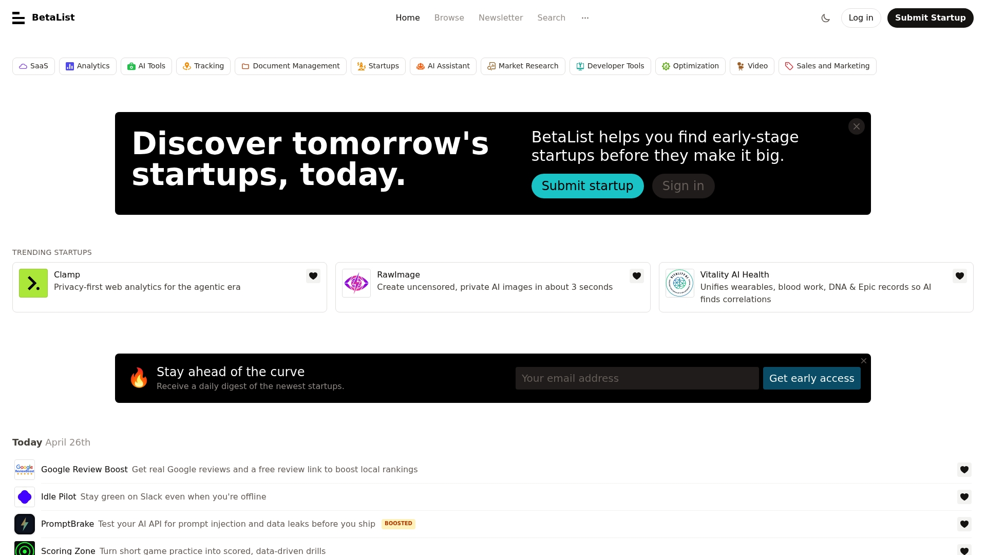 BetaList fokuserer på opdagelse med daglige digests, kategoriseret browsing og en fremhævet trending sektion der viser populære lanceringer. Brugere kan indsende startups, filtrere efter kategorier som SaaS og AI Tools og abonnere på nyhedsbreve.
