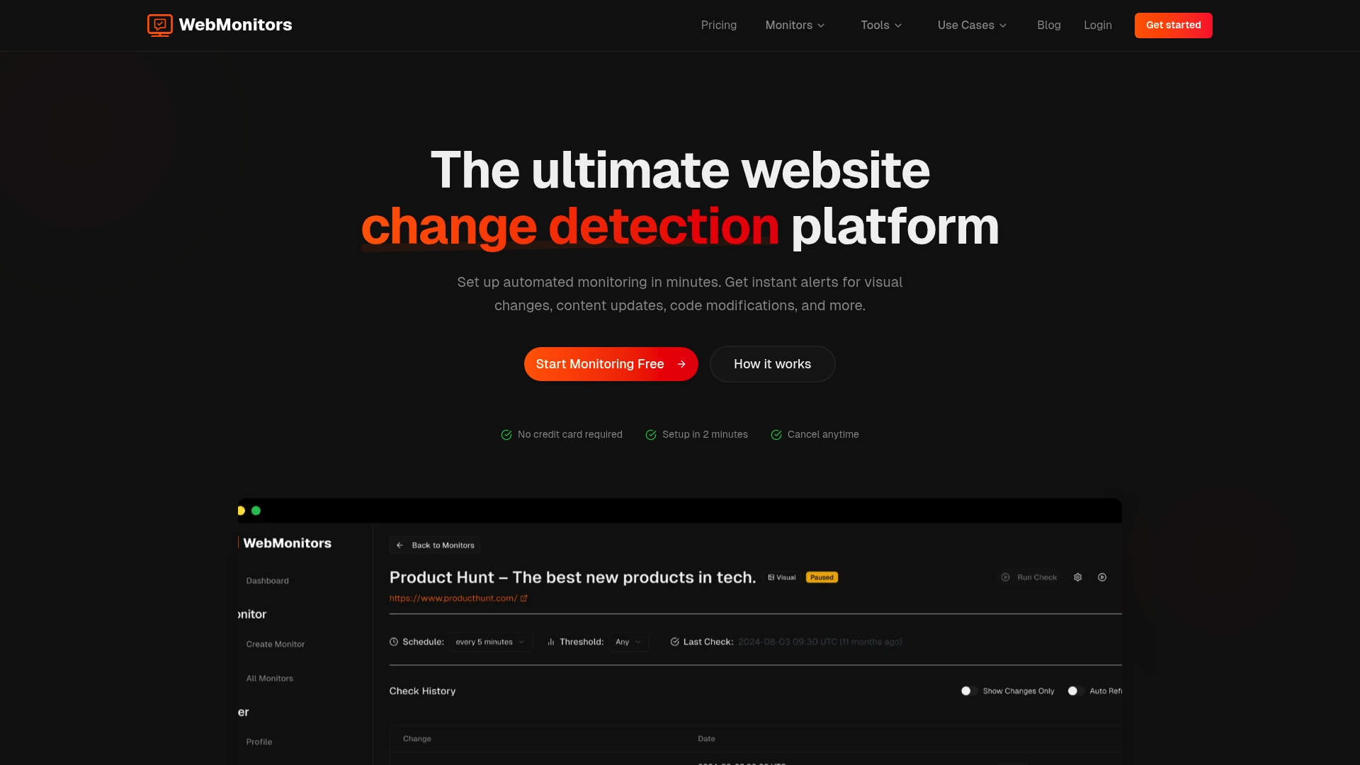 WebMonitors to narzędzie do automatycznego wykrywania zmian na stronach internetowych oferujące detekcję zmian wizualnych i powiadomienia w czasie rzeczywistym. Dobrze sprawdza się tam, gdzie potrzebujesz szybkich alertów i historycznych zapisów zmian dla decyzji marketingowych.