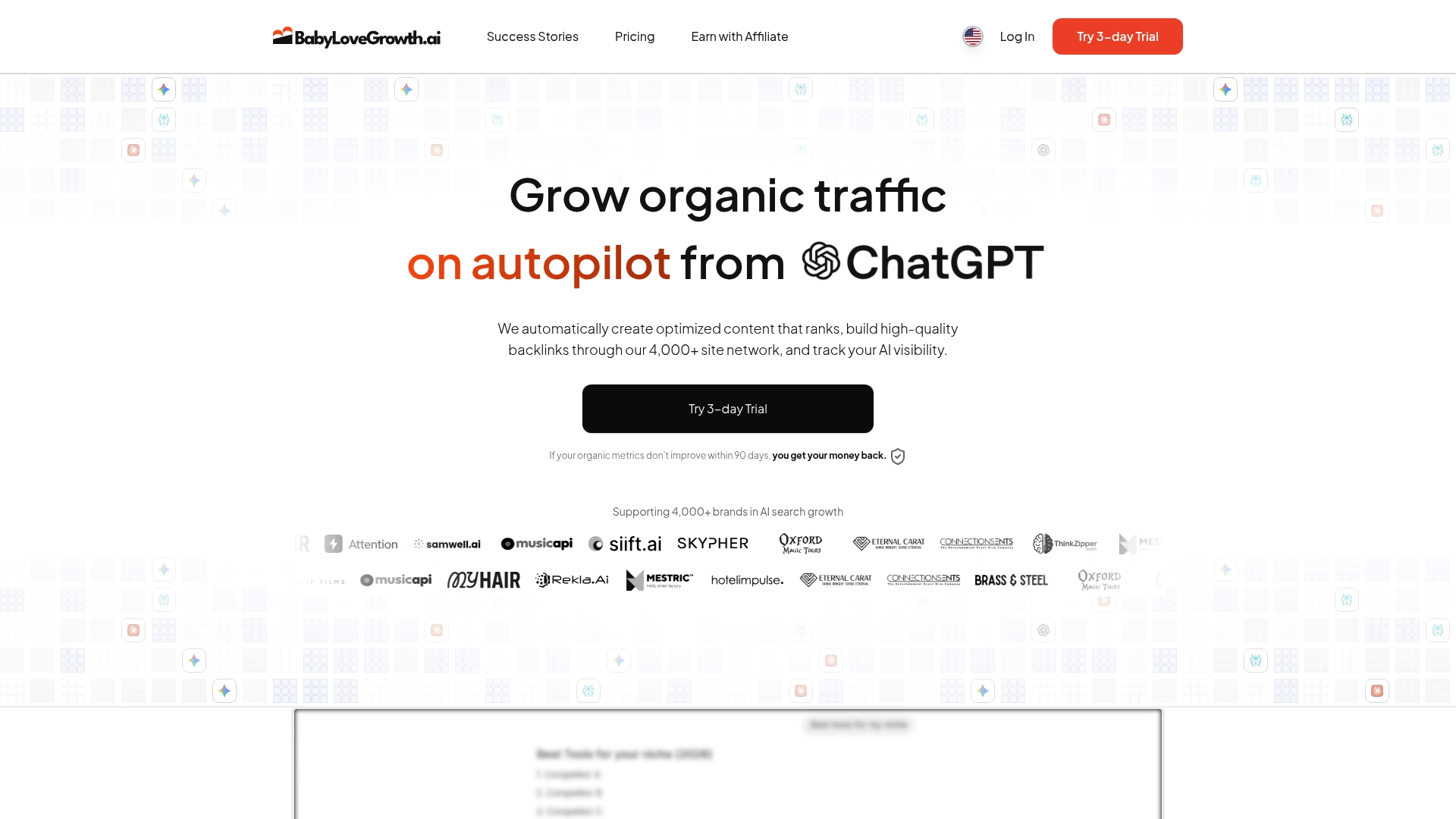 BabyLoveGrowth on AI-pohjainen SEO ja sisältömarkkinointialusta joka automatisoi optimoidun sisällön luomisen ja rakentaa laadukkaita backlinkkejä verkoston kautta. Se on suunniteltu kasvattamaan orgaanista liikennettä automaattitilassa yrityksille ja toimistoille.
