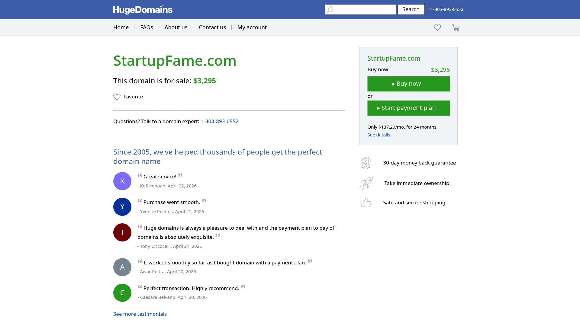 StartupFame.com tarjoaa yhdistelmän valmista brändiosoitetta ja ostoturvaa yhdestä paikasta. Maksusuunnitelma alentaa piikkikustannusta ja suuri domain kannattaa harkita osana laajempaa brändistrategiaa.