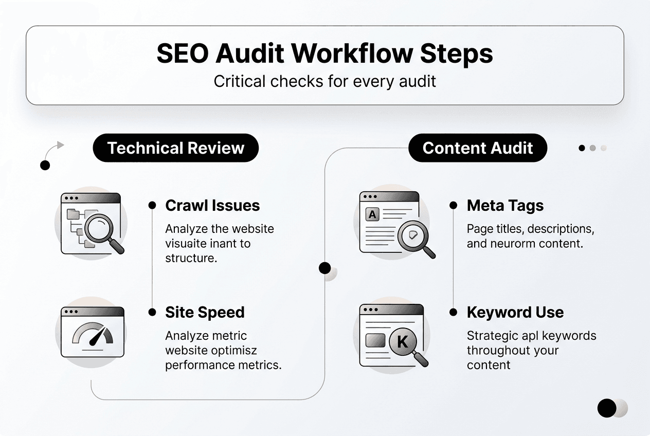 Structured workflows boost consistencyA clear SEO audit workflow ensures comprehensive coverage of technical, content, and backlink dimensions every time