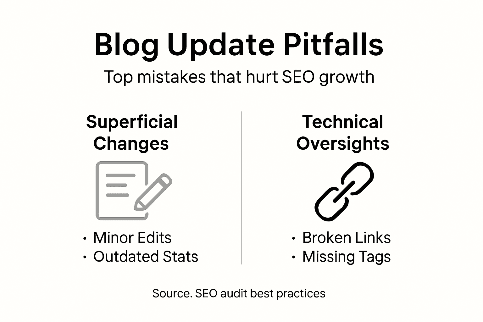 Common mistakes include superficial updates that don't add real value, ignoring technical SEO aspects, changing publication dates without meaningful content improvement, and disrupting mobile layouts, which can negatively affect search performance.