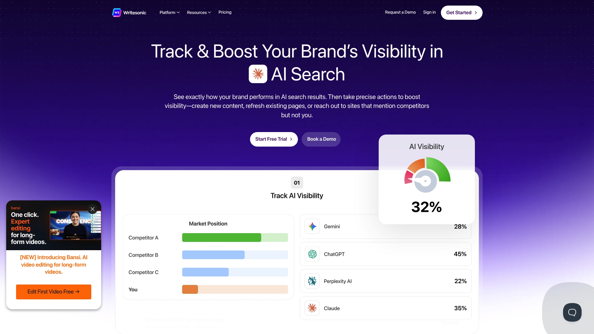 Writesonic Engine biedt een suite voor AI-gestuurde zichtbaarheid en contentoptimalisatie gericht op zowel Google als AI-platforms. De tool levert realtime tracking en actiegerichte inzichten die vooral handig zijn voor bureaus en groeigerichte bedrijven.