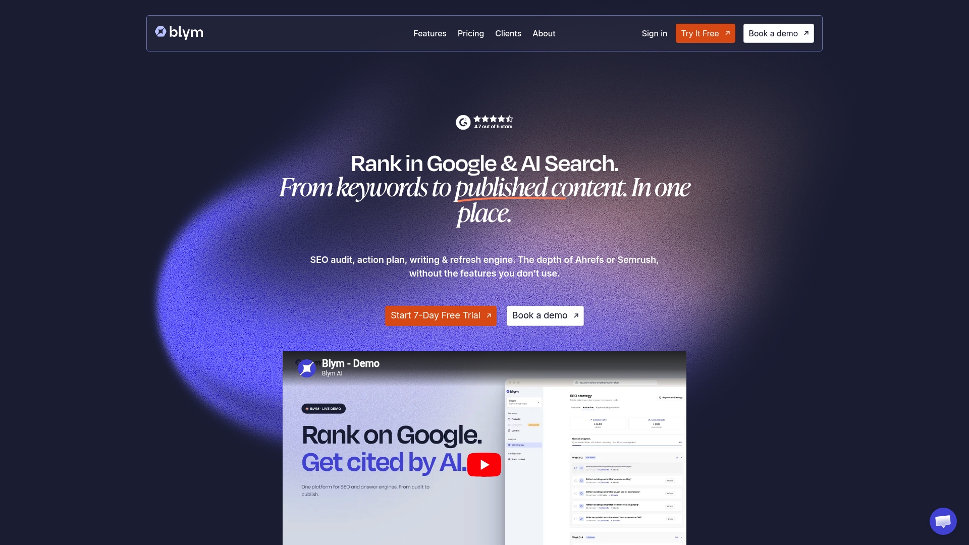 Blym is een AI-gestuurde SEO en content platform dat bedrijven helpt hoger te scoren in Google en AI-zoekmachines. Het richt zich op marketingteams en contentmakers die zoekzichtbaarheid willen verbeteren zonder ingewikkelde tools.