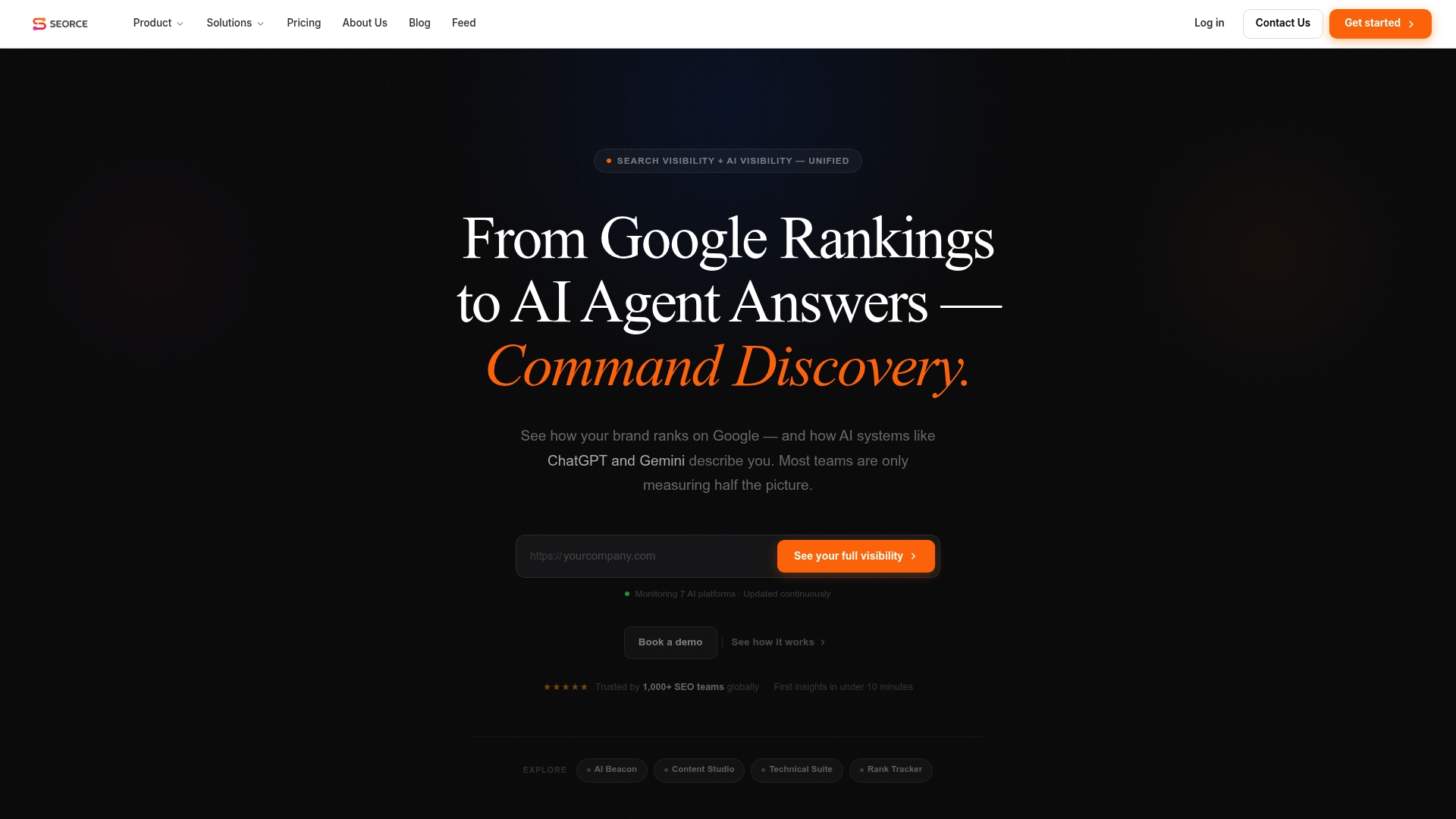 A proposta única de SEORCE é fornecer visibilidade unificada entre resultados tradicionais e respostas de IA, permitindo-te optimizar conteúdos e sinais técnicos com base em como os LLMs citam a tua marca. Isso transforma observações de IA em tarefas accionáveis.