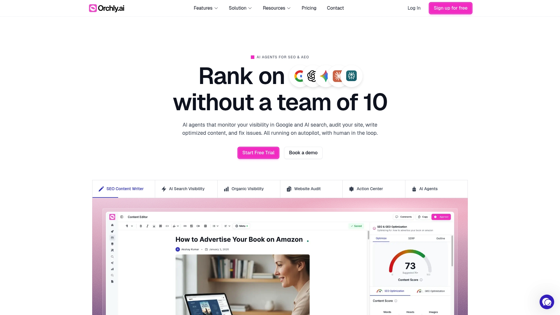 Orchly è una piattaforma AI per SEO e visibilità AI che unisce creazione di contenuti automatici e monitoraggio della presenza su motori di ricerca e piattaforme AI. Offre molte funzionalità per team e agenzie che gestiscono più siti e clienti.
