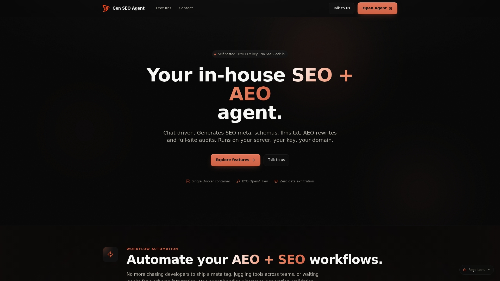 | Gen SEO Agent | Self-hosted AI SEO, audit sito completi, monitoraggio di multiple piattaforme AI | Controllo dei dati, automazione completa, pianificazione operazioni | Basato su costi server e chiavi API | Consulenti SEO e team tecnici per gestione su server privati |