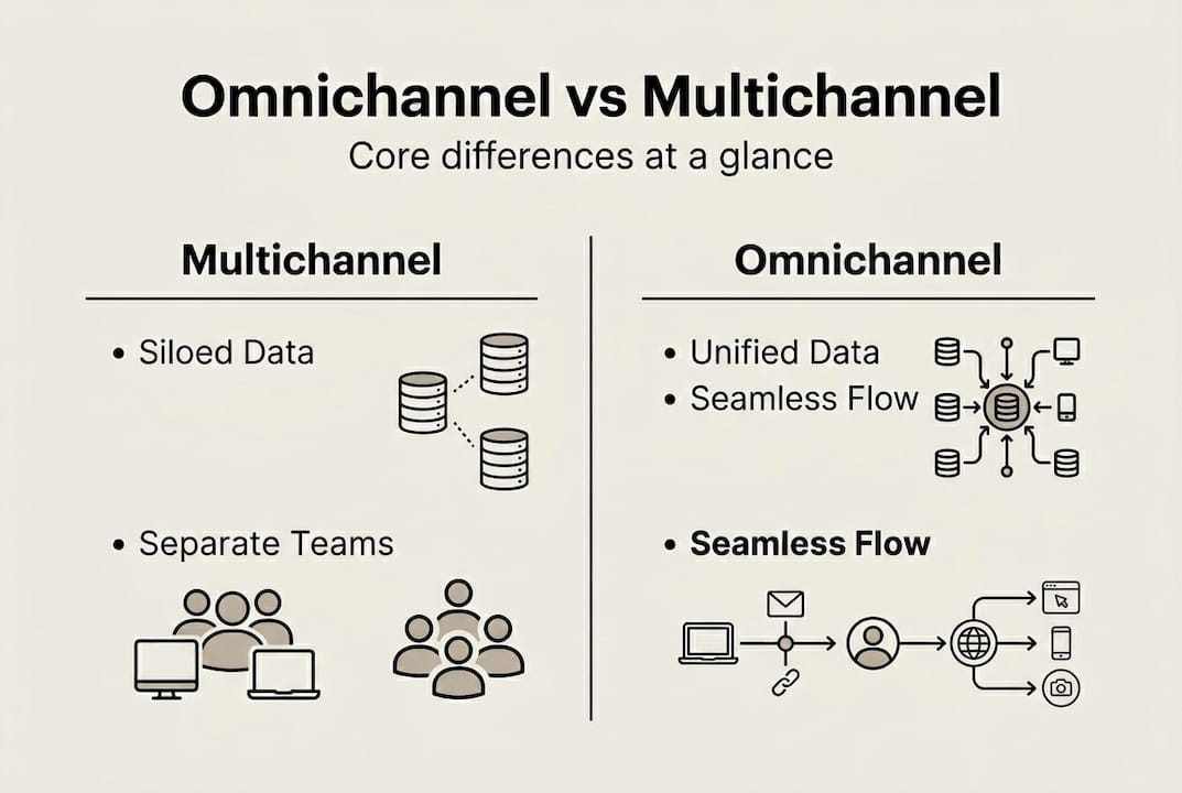 The core distinction is simple but consequential. Multichannel uses independent, siloed channels, while omnichannel integrates them for a seamless customer experience. In a multichannel setup, your email team, social team, and in-store team each operate with their own data and their own goals. In an omnichannel setup, they share a unified view of the customer and coordinate accordingly.