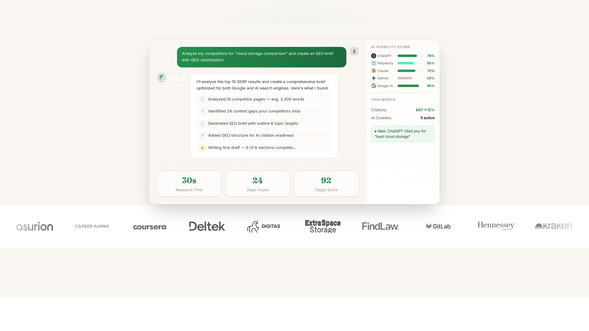 Een marketingteam gebruikt Frase om topconcurrenten te analyseren, geoptimaliseerde artikelen te genereren voor doelzoekwoorden en vervolgens de AI zichtbaarheid en citatiestatus te volgen op platforms zoals ChatGPT. Op basis van die inzichten verfijnen ze met kleine iteraties de teksten en de structuur van hun site om zowel Google als AI bronnen beter te bedienen.