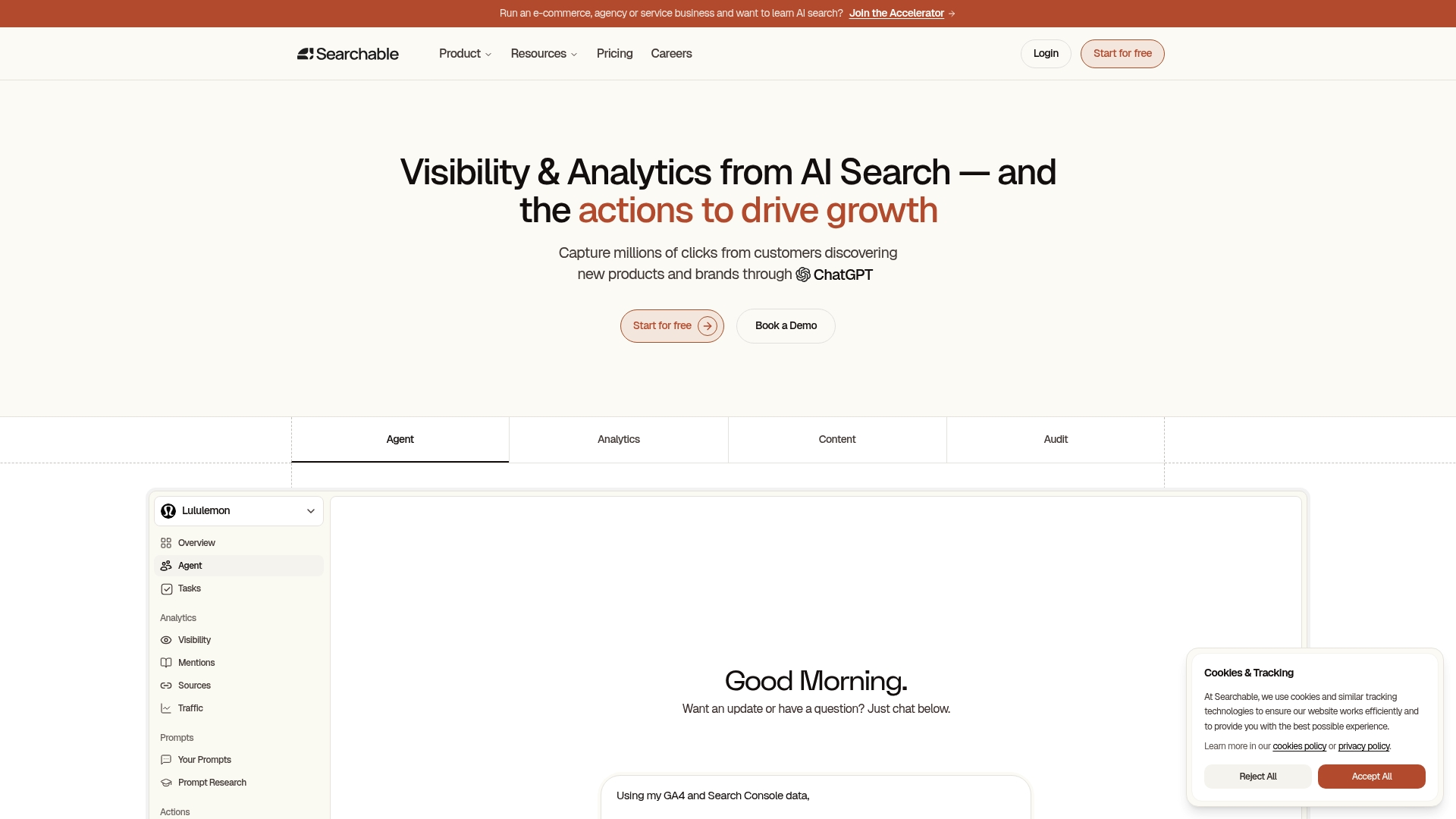 SearchableAI visibility tracking, technical auditsBuilt by experts<br>Offers personalized AI agents<br>Monitors multiple platformsBusinesses, agencies$50/month (Starter), $125/month (Pro)
