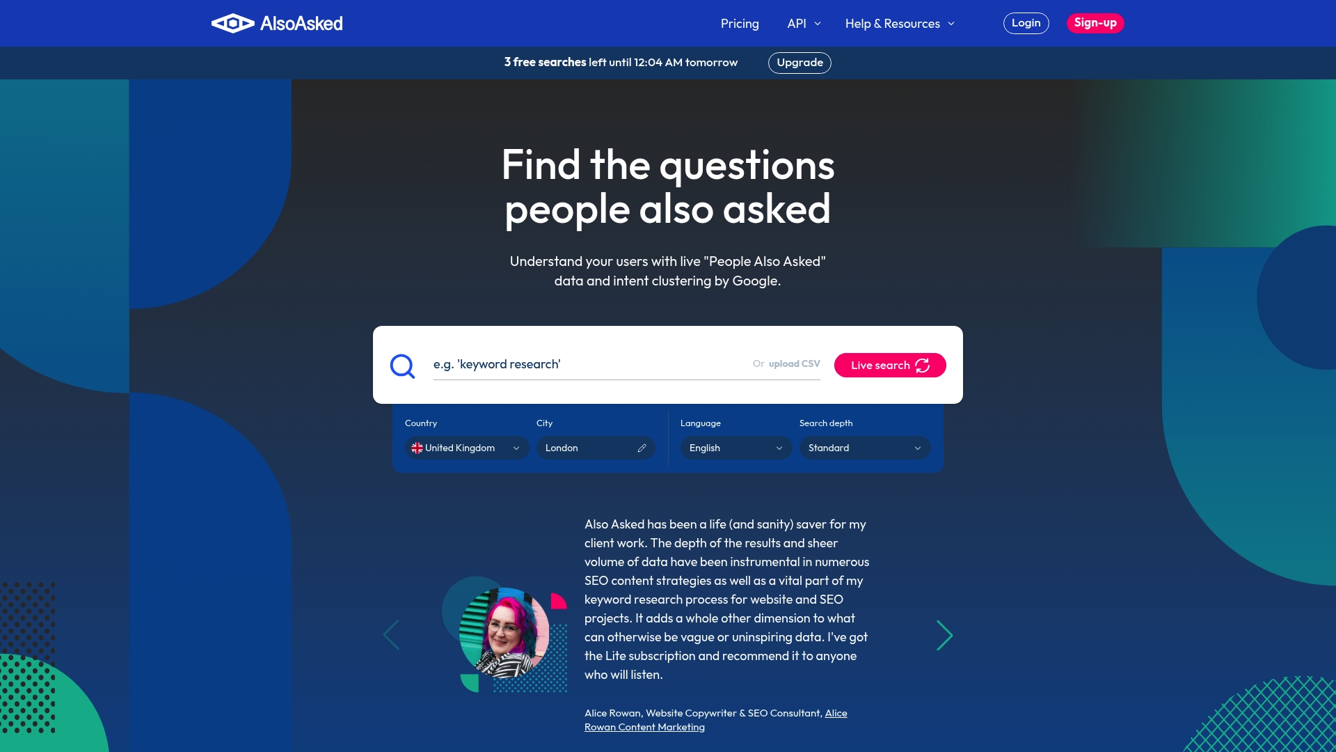 AlsoAsked pulls live People Also Asked data from Google to reveal how real searchers phrase questions and what they want. This helps you shape content around actual intent rather than guesswork.